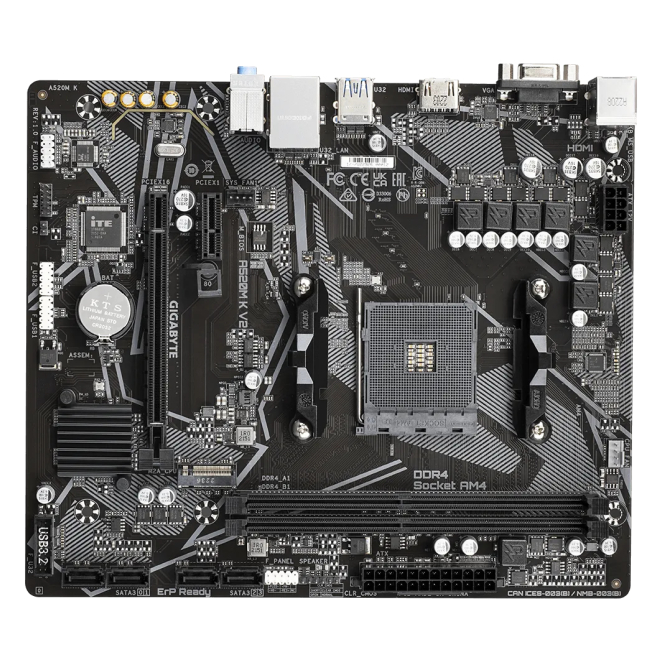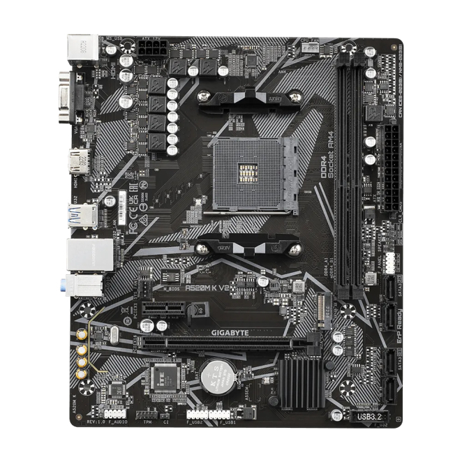 Comprar la GIGABYTE Placa base A520M K V2 te ofrece múltiples ventajas: Garantiza estar al día con los últimos procesadores. Ideal para aplicaciones de alta demanda. Incluye USB 3.2 Gen 1, M.2, SATA III y LAN GbE. Con la garantía de una de las marcas líderes en hardware de PC. Aquí encontrarás respuestas a las preguntas más comunes sobre la GIGABYTE Placa base A520M K V2. Sí, esta placa base es completamente compatible con los procesadores AMD Ryzen de la serie 5000. La GIGABYTE Placa base A520M K V2 soporta memoria DDR4 con velocidades de hasta 5100MHz en overclocking. La placa base cuenta con dos ranuras DIMM, compatibles con memoria en doble canal, tanto ECC como no ECC. Sí, la GIGABYTE Placa base A520M K V2 proporciona una ranura M.2 PCIe Gen3 x4 para soluciones de almacenamiento ultrarrápidas. Sí, cuenta con un conector USB 3.2 Gen 1, proporcionándote una transferencia de datos rápida y eficiente. Fabricante de procesador AMD Socket de procesador Zócalo AM4 Procesador compatible AMD Ryzen 3000 Series, AMD Ryzen 5000 Series Sockets de procesador soportados Zócalo AM4 tipos de memoria compatibles DDR4-SDRAM Número de ranuras de memoria 2 Tipo de ranuras de memoria DIMM Compatibilidad de ECC ECC y no ECC Velocidades de reloj de memoria soportadas 2133 MHz, 2400 MHz, 2667 MHz, 2933 MHz, 3200 MHz, 3400 MHz, 3466 MHz, 3600 MHz, 3733 MHz, 3866 MHz, 4000 MHz, 4133 MHz, 4266 MHz, 4400 MHz, 4600 MHz, 4800 MHz, 5100 MHz Velocidad del reloj de memoria máxima admitida 5100 MHz Memoria interna máxima 64 GB Canales de memoria Doble canal Memoria sin buffer Sí Tipos de unidades de almacenamiento admitidas HDD & SSD Interfaces de disco de almacenamiento soportados M.2, SATA III Niveles RAID 0, 1, 10 Compatibilidad con RAID Sí HDCP Sí Soporte para proceso paralelo No compatible Máxima resolución 4096 x 2160 Pixeles Conectores USB 3.2 Gen 1 (3.1 Gen 1) 1 Conector de potencia ATX (24 pines) Sí Conector TPM Sí Conector eléctrico de 12 V Sí Conector de instrusión a chasis Sí USB 2.0, conectores 2 Número de conectores SATA III 4 Conector de ventilador CPU Sí Conector de energía EPS (8-pin) Sí Conector de audio en panel frontal Sí Ethernet LAN (RJ-45) cantidad de puertos 1 Número de puertos HDMI 1 Cantidad de puertos tipo A USB 3.2 Gen 1 (3.1 Gen 1) 4 Cantidad de puertos VGA (D-Sub) 1 Número de puertos HDMI 1 Cantidad de puertos USB 2.0 2 Ethernet Sí Wifi No Tipo de interfaz ethernet Gigabit Ethernet Chipset AMD A520 Familia del chipset AMD Sistema operativo Windows soportado Windows 10 x64, Windows 11 x64 Canales de salida de audio 7.1 canales Componente para PC Monitoreo de la salud de PC Temperatura, Tensión, Ventilador Número de ranuras M.2 (M) 1 Tipos de BIOS UEFI AMI BIOS, tamaño de memoria 128 MB/s Versión ACPI 5.0 Versión de BIOS de administración del sistema (SMBIOS) 2.7 Jumper Clear CMOS Sí Versión de la interfaz de administración de escritorio (DMI) 2.7 Ancho 233 mm Profundidad 198 mm Altura 35 mm Peso de la batería 3 g Peso de litio por batería 0.07 g Número de celdas de batería 1 Peso de la batería 3 g Tecnología de batería Lithium-Manganese Dioxide (LiMnO2) Tipo de batería CR2032 Cables incluidos SATA Pilas incluidas Sí Software incluido Norton Internet Security Peso del paquete 675 g Ancho del paquete 265 mm Periodo de garantía 3 año(s)