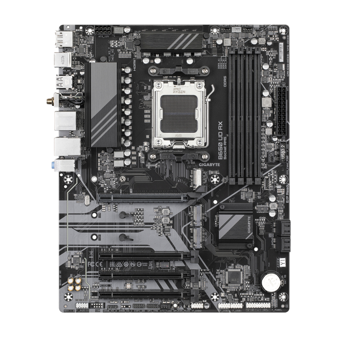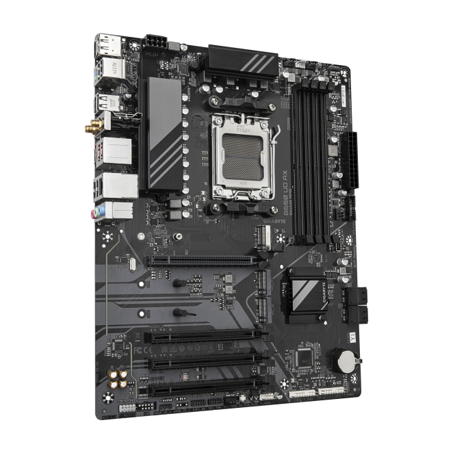Imagen de la placa base GIGABYTE B650 UD AX compatible con CPUs AMD Ryzen Serie 9000, VRM de 6+2+2 fases, hasta 7600MHz DDR5, PCIe 5.0 y 4.0 M.2, LAN GbE, Wi-Fi 6, USB 3.2 Gen 2. SKU B650 UD AX