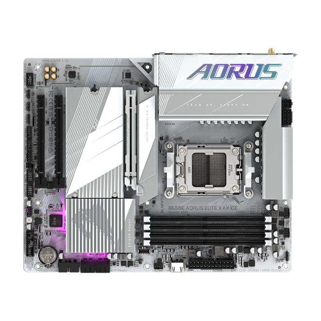 Imagen de la placa base GIGABYTE B650E AORUS ELITE X AX Ice compatible con AMD Ryzen serie 9000, VRM de 12+2+2 fases y hasta 8000 MHz DDR5 OC, SKU: B650E A ELITE X ICE