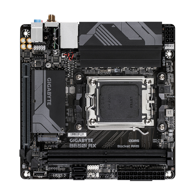 GIGABYTE B650I AX Placa base – AMD Ryzen serie 9000, VRM de 5+2+1 fases, hasta 6400 MHz DDR5 (OC), 1xPCIe 4.0 M.2, LAN 2,5 GbE, WIFI 6E, USB 3.2 Gen 2