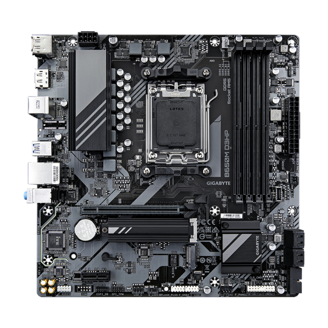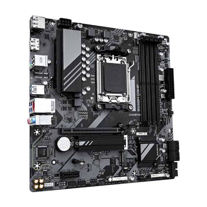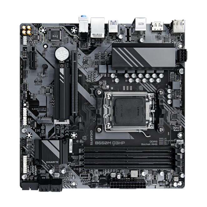 Imagen de la placa base GIGABYTE B650M D3HP compatible con AMD Ryzen serie 9000, VRM de 5+2+2 fases y hasta 7600 MHz DDR5, SKU B650M D3HP
