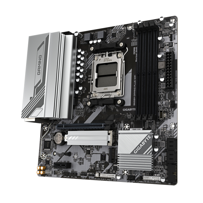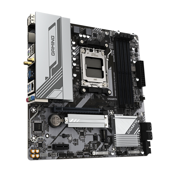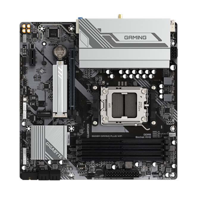 Imagen de la GIGABYTE B650M GAMING PLUS WIFI Placa base compatible con procesadores AMD Ryzen 9000, VRM de 5+2+2 fases, soporte hasta 8000 MHz DDR5, 2xPCIe 4.0 M.2, LAN 2.5GbE, WIFI 6E y USB 3.2 Gen 1. SKU B650M GAMING PLUS WF.