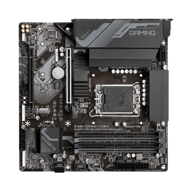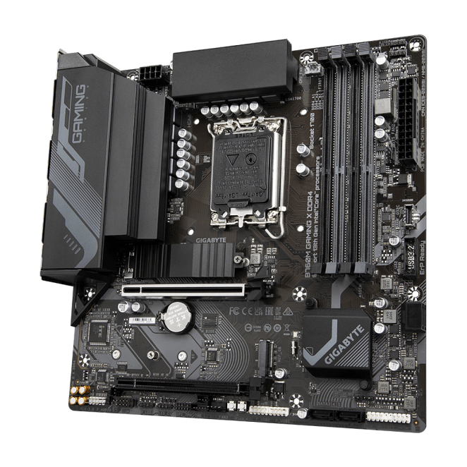 Imagen de la placa base GIGABYTE B760M Gaming X DDR4, compatible con CPUs Intel Core de 14ª generación, VRM digital 8+1+1 fases, soporte hasta 5333MHz DDR4 (OC), 2xPCIe 4.0 M.2, LAN 2.5GbE, USB 3.2 Gen2 – SKU B760M GAMING X DDR4