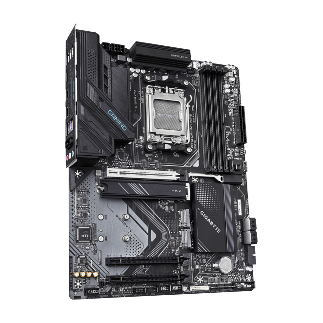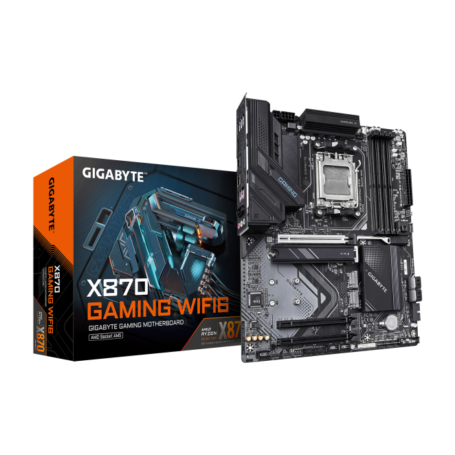 Imagen de la placa base GIGABYTE X870 GAMING Wi-Fi 6, compatible con CPUs AMD Ryzen 9000, 8+2+2 fases VRM, hasta 8000MHz DDR5 (OC), 1xPCIe 5.0 + 2xPCIe 4.0, Wi-Fi 6, LAN 2.5GbE, USB 4, SKU X870 GAMING WF6.
