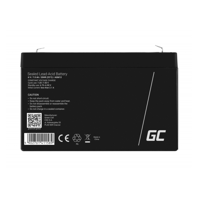 Batería recargable Green Cell AGM12, Sealed Lead Acid VRLA de 7000 mAh y 6 V, SKU: AGM12