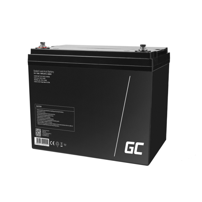 Imagen de la batería Green Cell modelo AGM25, sellada de ácido de plomo con 12 voltios y 75 amperios-hora, SKU AGM25, usada para sistemas de UPS.