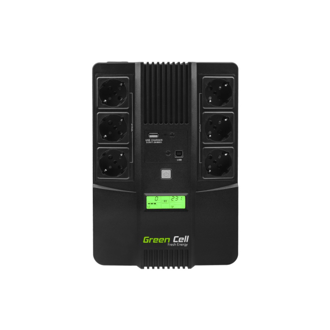 El Green Cell AiO 800VA LCD tiene una capacidad de salida de 0,8 kVA y una potencia de salida de 480 W.