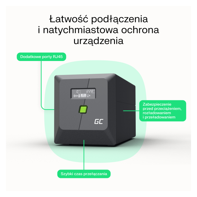 El Green Cell UPS asegura la continuidad operativa de tus dispositivos durante cortes de energía y fluctuaciones de voltaje.