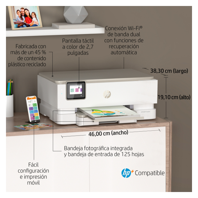 A continuación, resolvemos algunas de las preguntas más comunes sobre la HP ENVY Inspire 7220e Inalámbrico All-in-One Color Impresora: Sí, la HP ENVY Inspire 7220e es compatible con macOS y Windows, lo que la hace muy versátil para usuarios de diferentes sistemas operativos. Sí, la impresora viene con cartuchos de tinta iniciales tanto para color como para negro, permitiéndote comenzar a imprimir de inmediato. Sí, puedes imprimir desde tu smartphone utilizando la aplicación HP Smart, disponible para iOS y Android. Sí, esta impresora permite la impresión sin bordes, ideal para fotos y documentos especiales. La HP ENVY Inspire 7220e es compatible con varios tipos de papel, incluyendo papel fotográfico, papel normal, y papel reciclado. Modo de impresión a doble cara Auto Color de la resolución de impresión 4800 x 1200 DPI Resolución de impresión en blanco y negro 1200 x 1200 DPI Formatos de imagen soportados BMP, JPG, PNG, TIFF Tecnología de impresión Inyección de tinta térmica Impresión Impresión a color Impresión dúplex Sí Resolución máxima 4800 x 1200 DPI Velocidad de impresión (negro, calidad normal, A4/US Carta) 15 ppm Velocidad de impresión (color, calidad de bosquejo, A4/US Carta) 20 ppm Tiempo hasta primera página (negro, normal) 16 s Tiempo hasta primera página (color, normal) 18 s Copia a doble cara Sí Copiando Copia a color Resolución máxima de copia 600 x 600 DPI Tamaño máximo de impresión 209.9 x 349.6 mm Resolución óptica de escáner 1200 x 1200 DPI Escaneado dúplex No Escaneando Escaneo a color Tecnología de escaneado CIS Profundidad de entrada de color 24 bit Enviando por fax No Segmento HP Hogar Posicionamiento de mercado Hogar y oficina Funciones dúplex Imprimir Número de cartuchos de impresión 2 Colores de impresión Amarillo, Cian, Magenta, Negro Lenguajes de descripción de páginas PCL 3 GUI Formatos de imagen soportados BMP, JPG, PNG, TIFF País de origen China, Tailandia, Vietnam Cartuchos de repuesto Tipo de escaneado Escáner de cama plana Color del producto Beige Pantalla incorporada Sí Pantalla táctil Sí Tipo de control Tocar Pantalla a color Sí Diagonal de la pantalla 2.7 " Certificación Ciclo de trabajo (máximo) 1000 páginas por mes Escanear a E-mail Server, Software Controladores de escaneado TWAIN Memoria interna 256 MB Memoria interna máxima 256 MB Procesador incorporado Sí Nivel de potencia acústica (impresión) 6.3 dB Número total de bandejas de entrada 2 Capacidad de entrada total 125 hojas Capacidad de salida total 60 hojas Capacidad de salida máxima 60 hojas Capacidad de entrada máxima 125 hojas Tipos de papel Papel fotográfico, Papel grueso, Papel mate, Papel normal, Papel reciclado, Papel satinado ISO tamaño de serie A (A0...A9) A4, A5, A6 ISO tamaño de serie B (B0...B9) B5 ISO tamaño de serie C (C0...C9) C5, C6 Tamaño de impresora No-ISO 2L, Tarjeta Hagaki Tamaño de series JIS B (B0...B9) B5 Tamaño de sobres 10, C5, C6, DL Tamaño de papel fotográfico 10x15 cm, 10x30 cm, 13x13 cm, 13x18 cm Formato a medida, ancho 97.79-127 mm Formato a medida, largo 215-309 mm Peso del papel 75-300 g/m² Impresión directa Sí Puerto USB Sí Tecnología de impresión móvil Apple AirPrint, Mopria Print Service Wifi Sí Ethernet No Wi-Fi estándares 802.11a, 802.11b, 802.11g, Wi-Fi 4 (802.11n), Wi-Fi 5 (802.11ac) Encendido/Apagado automático HP Sí Requisitos de sistema recomendados Intel Pentium II, Celeron or 233 MHz or better processor; 2 GB available hard disk space; Internet connection; web browser HP GTIN (EAN/UPC) 195697742316, 195908882510, 195697742323 HP GTIN (EAN/UPC) with options (629) 195697742316; (686) 195908882510; (687) 195697742323 Consumo energético (en suspensión) 1.05 W Consumo de energía (apagado) 0.05 W Frecuencia de entrada AC 50/60 Hz Voltaje de entrada AC 100 - 240 V Sistema operativo Windows soportado Windows 10, Windows 11, Windows 7 Sistema operativo MAC soportado Mac OS X 10.14 Mojave, Mac OS X 13.0 Ventura Otros sistemas operativos soportados ChromeOS Cumplimiento de sostenibilidad Sí Certificados de sostenibilidad Post-Consumer Recycled Plastic Materiales y tecnologías sostenibles 45 % de plástico reciclado posconsumo; Reciclable a través del programa HP Planet Partners; Impresiones responsables con el medio ambiente con HP+ Total de huella de carbono (kg of CO2e) 70 Emisiones de carbono, fabricación (kg de CO2e) 62 Emisiones de carbono, logística (kg de CO2e) 3 Emisiones de carbono, fin de vida útil (kg de CO2e) 4 Emisiones de carbono, sin fase de uso (kg de CO2e) 3 Intervalo de temperatura operativa 5-40 °C Intervalo de temperatura de almacenaje -40-60 °C Intervalo de humedad relativa para funcionamiento 20-80 % Intervalo de humedad para funcionamiento recomendado 20-80 % Ancho 460 mm Profundidad 383 mm Altura 191 mm Peso 6910 g Ancho del paquete 570 mm Profundidad del paquete 254 mm Altura del paquete 464 mm Peso del paquete 8660 g Cables incluidos Corriente alterna Cartucho (s) incluido Sí Capacidad de cartucho incluido (negro) 125 páginas Capacidad de cartucho incluido (CMY) 120 páginas
