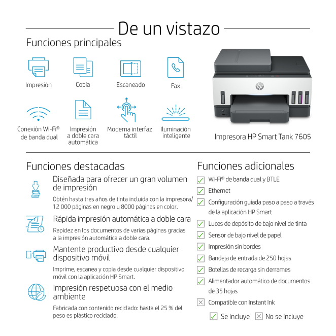La impresora HP Smart Tank 7605 es ideal para tanto hogares como oficinas que necesitan un dispositivo fiable y multifuncional. Este producto es perfecto para usuarios que buscan una impresora todo en uno capaz de manejar impresiones de alta calidad, escaneos precisos, y copias rápidas. Profesionales que trabajan desde casa encontrarán en esta impresora una herramienta esencial para mantener su productividad, mientras que las pequeñas empresas pueden beneficiarse de su eficiencia y bajo costo operativo.