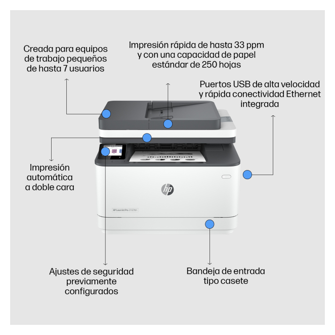 No, los cables de red no están incluidos con el producto, por lo que deben adquirirse por separado. El cartucho incluido tiene una capacidad de 1000 páginas impresas en negro. No, esta impresora no tiene conectividad Wi-Fi, pero puede conectarse a través de Ethernet. No, esta impresora está diseñada exclusivamente para impresión en blanco y negro. Puede manejar tamaños de papel ISO A4, así como formatos personalizados de 76-216 mm de ancho y 127-356 mm de largo. Modo de impresión a doble cara Auto Resolución de impresión en blanco y negro 1200 x 1200 DPI Formatos de imagen soportados JPG, TIFF Tecnología de impresión Laser Impresión Impresión en blanco y negro Impresión dúplex Sí Resolución máxima 1200 x 1200 DPI Velocidad de impresión (negro, calidad normal, A4/US Carta) 33 ppm Tiempo de calentamiento 35 s Impresión segura Sí Copia a doble cara Sí Copiando Copias en blanco y negro Resolución máxima de copia 300 x 300 DPI Tamaño máximo de impresión 207 x 348 mm Resolución óptica de escáner 1200 x 1200 DPI Resolución óptica de escaneado (ADF) 300 x 300 DPI Escaneado dúplex No Escaneando Escaneo a color Tecnología de escaneado CIS Profundidad de entrada de color 24 bit Enviando por fax Envío y recepción de faxes en blanco y negro Segmento HP Pequeña y mediana empresa Posicionamiento de mercado Negocios Funciones dúplex Copiar, Imprimir Número de cartuchos de impresión 1 Colores de impresión Negro Lenguajes de descripción de páginas PCL 5c, PCL 6, PCLm, PCLmS, PDF, PWG, URF Fuentes de impresora Scalable, TrueType Formatos de imagen soportados JPG, TIFF País de origen Vietnam Cartuchos de repuesto Tipo de escaneado Escáner plano y alimentador automático de documentos (ADF, Automatic Document Feeder) Color del producto Blanco Pantalla CGD Pantalla incorporada Sí Tipo de control Tocar Pantalla a color Sí Diagonal de la pantalla 2.7 " Certificación CISPR32:2012 & CISPR32:2015 /EN55032:2012 & EN55032:2015+AC:2016 - Class B; EN 61000-3-2:2014; EN 61000-3-3:2013; EN 55035:2017; FCC Title 47 CFR, Part 15 Class B/ICES-003, Issue 6 Ciclo de trabajo (máximo) 50000 páginas por mes Escanear a Software, TWAIN Controladores de escaneado TWAIN Memoria interna 512 MB Memoria interna máxima 512 MB Procesador incorporado Sí Nivel de presión acústica (impresión) 53 dB Nivel de potencia acústica (impresión) 6.6 dB Emisiones de presión acústica en modo de espera (lista) 14 dB Emisiones de potencia acústica (lista) 32 dB Número total de bandejas de entrada 1 Capacidad de entrada total 250 hojas Capacidad de entrada de la bandeja de papel 1 250 hojas Capacidad de salida total 150 hojas Capacidad de salida máxima 150 hojas Capacidad de entrada máxima 250 hojas Alimentador automático de documentos (ADF, Automatic document feeder) Sí Capacidad del alimentador automático de documentos 50 hojas Tipos de papel Etiquetas, Hoja suelta, Papel normal, Papel satinado, Postal, Sobres ISO tamaño de serie A (A0...A9) A4, A5, A6 ISO tamaño de serie B (B0...B9) B5 ISO tamaño de serie C (C0...C9) C5, C6 Tamaño de impresora No-ISO 16K, L, Oficio Tamaño de series JIS B (B0...B9) B6 Tamaño de sobres B5, C5, C6, DL Tamaño de papel fotográfico 10x15 cm Formato a medida, ancho 76-216 mm Formato a medida, largo 127-356 mm Peso del papel 60-163 g/m² Impresión directa Sí Puerto USB Sí Tecnología de impresión móvil Apple AirPrint, Mopria Print Service Wifi No Ethernet Sí Tecnología de cableado 10/100Base-T(X) Ethernet LAN, velocidad de transferencia de datos 10 Mbit/s, 100 Mbit/s Requisitos de sistema recomendados Microsoft® Windows® 11, 10, 2 GB available hard disk space, Internet connection, Microsoft® Internet Explorer or Edge. HP GTIN (EAN/UPC) 195122461737, 195122461744, 195122461751 HP GTIN (EAN/UPC) with options (ABT) 195122461737; (ABY) 195122461744; (B19) 195122461751 Consumo energético (en suspensión) 1.31 W Consumo de energía (apagado) 0.06 W Consumo de energía (ahorro) 0.06 W Enery Star Consumo Electrico Típico (TEC) 0.407 kWh/semana Frecuencia de entrada AC 50/60 Hz Voltaje de entrada AC 110 - 240 V Sistema operativo Windows soportado Windows 10, Windows 11 Sistema operativo MAC soportado Mac OS X 10.15 Catalina, Mac OS X 11.0 Big Sur, Mac OS X 12.0 Monterey Sistema operativo Linux soportado Si Otros sistemas operativos soportados Linux Cumplimiento de sostenibilidad Sí Certificados de sostenibilidad Blue Angel Materiales y tecnologías sostenibles Sin mercurio No contiene Mercurio Total de huella de carbono (kg of CO2e) 160 Emisiones de carbono, fabricación (kg de CO2e) 103 Emisiones de carbono, logística (kg de CO2e) 12 Emisiones de carbono, fin de vida útil (kg de CO2e) 19 Emisiones de carbono, sin fase de uso (kg de CO2e) 26 Intervalo de temperatura operativa 15-32.5 °C Intervalo de temperatura de almacenaje -20-60 °C Intervalo de humedad relativa para funcionamiento 10-80 % Intervalo de humedad para funcionamiento recomendado 30-70 % Ancho 418 mm Profundidad 398.2 mm Altura 313.2 mm Peso 10500 g Ancho del paquete 497 mm Profundidad del paquete 379 mm Altura del paquete 490 mm Peso del paquete 13600 g Cables incluidos Corriente alterna Tarjeta de garantía Sí Cartucho (s) incluido Sí Capacidad de cartucho incluido (negro) 1000 páginas