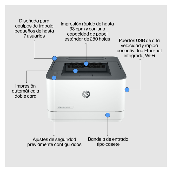 La HP Impresora LaserJet Pro 3002dw es perfecta para profesionales y pequeñas empresas que requieren altas velocidades de impresión y calidad impecable. Ideal para administradores,