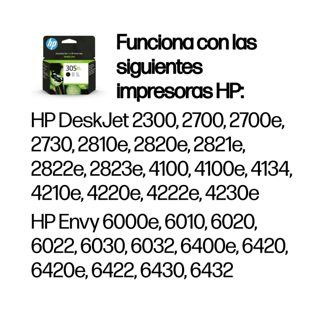 El HP Cartucho de tinta Original 305XL de alta capacidad negro es compatible con las impresoras HP DeskJet 1200, 2300, 2700, 2730, 2755, 4100, 4134, 4155, y HP ENVY 6020, 6022, 6030, 6032, 6052, 6055, 6420, 6422, 6430, 6432, 6452, 6455.