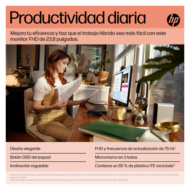 En esta sección, respondemos a algunas de las preguntas más comunes sobre el HP Monitor P24 G5 FHD para ayudarte a tomar una decisión informada. El HP Monitor P24 G5 FHD utiliza un panel IPS (In-Plane Switching), lo que proporciona ángulos de visión más amplios y mejor reproducción del color en comparación con otros tipos de paneles. Si bien el HP Monitor P24 G5 FHD tiene un tiempo de respuesta de 5ms y una frecuencia de actualización de 75Hz, lo cual es suficiente para uso general, puede no ser la mejor opción para juegos de alta velocidad o eSports donde se requiere una tasa de actualización más alta y menor tiempo de respuesta. No, este monitor no tiene altavoces incorporados. Sin embargo, puedes conectar auriculares o altavoces externos mediante el puerto HDMI. Sí, el HP Monitor P24 G5 FHD es compatible con montaje VESA, lo que te permite montarlo en la pared para ahorrar espacio en el escritorio. Este monitor cuenta con tecnología de baja luz azul (Low Blue Light), que reduce la emisión de luz azul dañina, ayudando a prevenir la fatiga ocular durante largas horas de uso. Diagonal de la pantalla 23.8 " Resolución de la pantalla 1920 x 1080 Pixeles Tipo HD Full HD Relación de aspecto nativa 16:9 Relación de aspecto 16:9 Tecnología de visualización LCD Tipo de pantalla IPS Tipo de retroiluminación Edge LED Pantalla táctil No Brillo de la pantalla (típico) 250 cd / m² Tiempo de respuesta 5 ms Superficie de la pantalla Mate Pantalla antirreflectante Sí Forma de la pantalla Plana Formatos gráficos soportados 1024 x 768 (XGA), 1280 x 1024 (SXGA), 1280 x 720 (HD 720), 1280 x 800, 1440 x 900 (WXGA+), 1600 x 900, 1680 x 1050 (WSXGA+), 1920 x 1080 (HD 1080), 640 x 480 (VGA), 720 x 400, 800 x 600 (SVGA) Razón de contraste (típica) 1000:1 Relación de contraste (dinámico) 8000000:1 Máxima velocidad de actualización 75 Hz Ángulo de visión, horizontal 178 ° Ángulo de visión, vertical 178 ° Número de colores de la pantalla 16,7 millones de colores Tamaño de pixel 0,27 x 0,27 mm Densidad del pixel 93 ppp Intervalo de escaneado horizontal 30-86 kHz Intervalo de escaneado vertical 48-75 Hz Tamaño visible, horizontal 527 mm Tamaño visible, vertical 296.4 mm Diagonal de pantalla 60.5 cm Dureza de la superficie 3H Gama de colores estándar NTSC Gama de colores 72 % Profundidad de color 8 bit Cobertura NTSC (típica) 72 % NVIDIA G-SYNC No AMD FreeSync No Tecnología Low Blue Light (baja luz azul) Sí Altavoces incorporados No Cámara incorporada No Posicionamiento de mercado Negocios Color del producto Negro Soporte desmontable Sí Color de pies Negro Conector USB incorporado No Cantidad de puertos VGA (D-Sub) 1 HDMI Sí Número de puertos HDMI 1 Versión HDMI 1.4 Cantidad de DisplayPorts 1 Versión de DisplayPort 1.2 Salida de auriculares No HDCP Sí montaje VESA Sí Interfaz de panel de montaje 100 x 100 mm Ranura para cable de seguridad Sí Ajustes de altura No Ajuste de la inclinación Sí Ángulo de inclinación -5-23 ° Exhibición en pantalla (OSD) Sí Clase de eficiencia energética (SDR) E Clase de eficiencia energética (HDR) E Consumo de energía (SDR) por 1000 horas 15 kWh Consumo energético 20 W Consumo de energía (inactivo) 0.5 W Consumo de energía (max) 30 W Consumo de energía (apagado) 0.3 W Voltaje de entrada AC 100 - 240 V Frecuencia de entrada AC 50/60 Hz Tipo de fuente de alimentación Interno Escala de eficiencia energética De la A a la G Código EPREL (Registro europeo de productos para el etiquetado energético) 1241671 Intervalo de temperatura operativa 5-35 °C Intervalo de humedad relativa para funcionamiento 5-95 % Intervalo de humedad relativa durante almacenaje 20-80 % Ancho del dispositivo (con soporte) 538.9 mm Profundidad dispositivo (con soporte) 180.5 mm Altura del dispositivo (con soporte) 397.9 mm Peso (con soporte) 3780 g Ancho (sin base) 538.9 mm Profundidad (sin base) 51.4 mm Altura (sin base) 323.6 mm Ancho del paquete 595 mm Profundidad del paquete 124 mm Altura del paquete 391 mm Peso del paquete 5940 g Tipo de embalaje Caja Stand incluido Sí Cables incluidos Corriente alterna, HDMI Guía de configuración rápida Sí Certificados de sostenibilidad ENERGY STAR Total de huella de carbono (kg of CO2e) 150 Emisiones de carbono, fabricación (kg de CO2e) 81 Emisiones de carbono, logística (kg de CO2e) 2 Emisiones de carbono, fin de vida útil (kg de CO2e) 2 Emisiones de carbono, sin fase de uso (kg de CO2e) 63 Certificados de conformidad BIS, BSMI, C-TICK, CB, CCC, CE, CECP, CEL, Comisión Federal de Comunicaciones (FCC) de Estados Unidos, cTUVus, EAC, RCM, VCCI Certificación