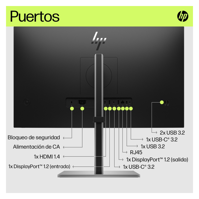 Resuelve tus dudas con las preguntas frecuentes acerca del HP Monitor USB-C QHD E27u G5: Sí, gracias a su puerto USB-C, es totalmente compatible con MacBooks y otros dispositivos que soportan conexiones USB-C. Aunque no está específicamente diseñado para gaming, su alta resolución y tiempo de respuesta de 5 ms lo hacen adecuado para juegos no competitivos. No, el monitor HP E27u G5 cuenta con un soporte de montaje VESA integrado, lo que facilita su instalación en la pared. No, este modelo no incluye altavoces incorporados, pero tiene puertos USB y HDMI que permiten conexión a dispositivos de audio externos. Sí, con su alta resolución QHD, cobertura sRGB del 99% y pantalla IPS, ofrece una excelente precisión de color, ideal para diseñadores gráficos. Diagonal de la pantalla 27 " Resolución de la pantalla 2560 x 1440 Pixeles Tipo HD Quad HD Relación de aspecto nativa 16:9 Relación de aspecto 16:9 Tecnología de visualización LCD Tipo de pantalla IPS Tipo de retroiluminación Edge LED Pantalla táctil No Brillo de la pantalla (típico) 350 cd / m² Tiempo de respuesta 5 ms Superficie de la pantalla Mate Pantalla antirreflectante Sí Forma de la pantalla Plana Formatos gráficos soportados 1024 x 768 (XGA), 1280 x 1024 (SXGA), 1280 x 720 (HD 720), 1440 x 900 (WXGA+), 1600 x 900, 1680 x 1050 (WSXGA+), 1680 x 1200, 1920 x 1080 (HD 1080), 1920 x 1200 (WUXGA), 2560 x 1440, 640 x 480 (VGA), 720 x 400, 800 x 600 (SVGA) Razón de contraste (típica) 1000:1 Relación de contraste (dinámico) 8000000:1 Máxima velocidad de actualización 75 Hz Ángulo de visión, horizontal 178 ° Ángulo de visión, vertical 178 ° Número de colores de la pantalla 16,7 millones de colores Tamaño de pixel 0,23 x 0,23 mm Densidad del pixel 109 ppp Intervalo de escaneado horizontal 30-120 kHz Intervalo de escaneado vertical 50-75 Hz Tamaño visible, horizontal 596.7 mm Tamaño visible, vertical 335.7 mm Diagonal de pantalla 68.6 cm Dureza de la superficie 3H Gama de colores estándar sRGB Gama de colores 99 % Profundidad de color 8 bit Cobertura sRGB (típica) 99 % NVIDIA G-SYNC No AMD FreeSync No Tecnología Flicker free (reduce el parpadeo de la pantalla) Sí Tecnología Low Blue Light (baja luz azul) Sí Carga rápida Sí Altavoces incorporados No Cámara incorporada No Posicionamiento de mercado Negocios Color del producto Negro Soporte desmontable Sí Color de pies Negro, Plata Conector USB incorporado Sí Versión de conector USB 3.2 Gen 1 (3.1 Gen 1) Tipo de puerto USB de carga USB Tipo C Número de puertos ascendentes USB Tipo C 1 Cantidad de puertos USB descendentes de tipo A 3 Cantidad de puertos downstream USB tipo C 1 USB Type-C DisplayPort Alternate Mode Sí Suministro de potencia USB Sí Entrega de energía USB (USB Power Delivery) de hasta 65 W HDMI Sí Número de puertos HDMI 1 Versión HDMI 1.4 Cantidad de DisplayPorts 1 Versión de DisplayPort 1.2 Salida de auriculares No Ethernet Sí montaje VESA Sí Interfaz de panel de montaje 100 x 100 mm Ranura para cable de seguridad Sí Ajustes de altura Sí Altura ajustable (máx.) 150 mm Eje Sí Ángulo de pivote -90-90 ° Giratorio Sí Ángulo de giro (alcance) -45-45 ° Ajuste de la inclinación Sí Ángulo de inclinación -5-20 ° Exhibición en pantalla (OSD) Sí Clase de eficiencia energética (SDR) F Clase de eficiencia energética (HDR) F Consumo energético 34.5 W Consumo de energía (inactivo) 0.5 W Consumo de energía (max) 160 W Consumo de energía (apagado) 0.3 W Voltaje de entrada AC 100 - 240 V Frecuencia de entrada AC 50/60 Hz Tipo de fuente de alimentación Interno Escala de eficiencia energética De la A a la G Código EPREL (Registro europeo de productos para el etiquetado energético) 1400357 Intervalo de temperatura operativa 5-35 °C Intervalo de humedad relativa para funcionamiento 5-95 % Intervalo de humedad relativa durante almacenaje 20-80 % Ancho del dispositivo (con soporte) 613.4 mm Profundidad dispositivo (con soporte) 168.5 mm Altura del dispositivo (con soporte) 544.7 mm Peso (con soporte) 7200 g Ancho (sin base) 613.4 mm Profundidad (sin base) 74.7 mm Altura (sin base) 364.6 mm Ancho del paquete 699 mm Profundidad del paquete 160 mm Altura del paquete 446 mm Peso del paquete 9700 g Tipo de embalaje Caja Stand incluido Sí Cables incluidos Corriente alterna, USB tipo C a USB tipo C Guía de configuración rápida Sí Certificados de sostenibilidad ENERGY STAR Total de huella de carbono (kg of CO2e) 230 Emisiones de carbono, fabricación (kg de CO2e) 141 Emisiones de carbono, logística (kg de CO2e) 3 Emisiones de carbono, fin de vida útil (kg de CO2e) 3 Emisiones de carbono, sin fase de uso (kg de CO2e) 84 Certificados de conformidad BIS, BSMI, CB, CCC, CE, CECP, CEL, Comisión Federal de Comunicaciones (FCC) de Estados Unidos, cTUVus, EAC, KCC, Norma Oficial Mexicana (NOM), PSE, VCCI, WEEE Ethernet LAN (RJ-45) cantidad de puertos 1 Certificación Cantidad de puertos RJ-45 1