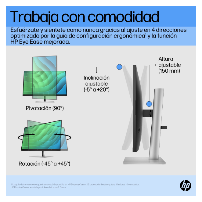 El monitor HP FHD E27 G5 no solo es eficiente, sino también cómodo de usar. Su soporte ajustable permite configurarlo a la altura, inclinación y ángulo deseado, mejorando la postura y reduciendo la fatiga. La pantalla de alta definición ofrece colores brillantes y detalles precisos, lo que mejora la productividad y la satisfacción general del usuario. Además, su tecnología Low Blue Light previene la fatiga visual, permitiendo trabajar durante horas sin molestias.