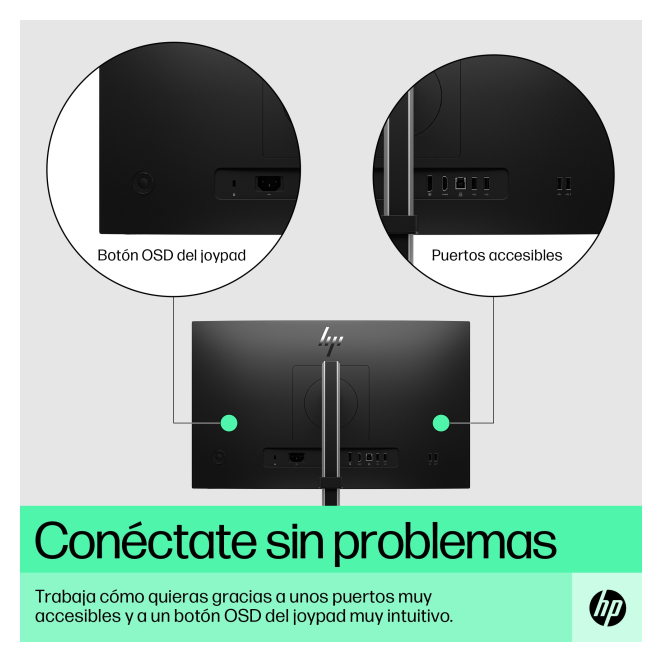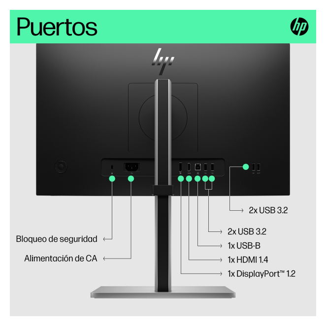 El Monitor HP E-Series FHD E22 G5 ofrece múltiples opciones de conectividad, incluyendo puertos HDMI, DisplayPort y USB 3.2 Gen 1.