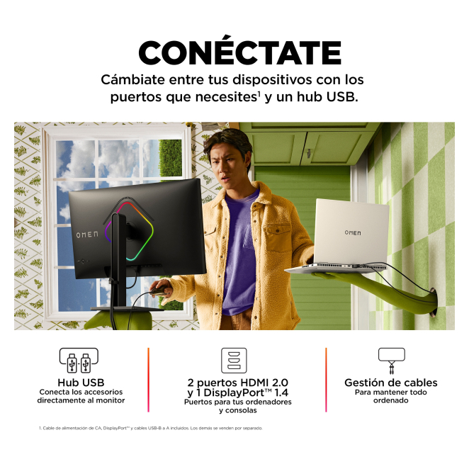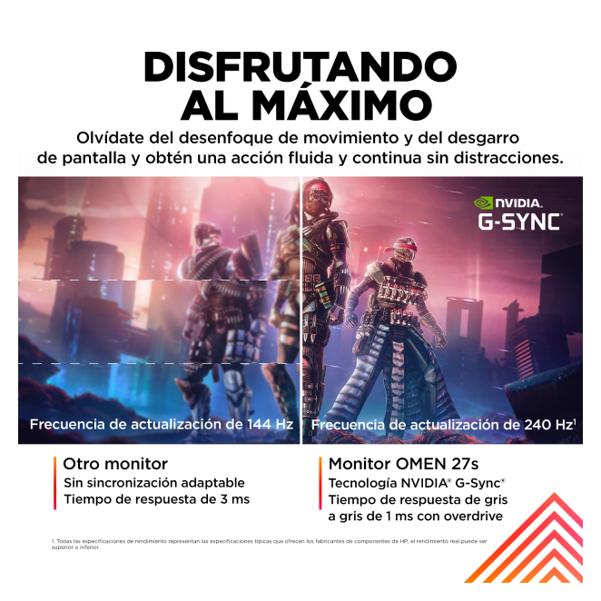 OMEN by HP Monitor gaming de 27 pulgadas con resolución FHD y 240 Hz – 780G5E9#ABB. Perfecto para juegos competitivos con alta tasa de refresco y claridad en la imagen. Financiado desde: 14,95 € /mes Stock disponible en nuestros almacenes Métodos de pago: Solicita información en caso de necesitar envío urgente. OMEN by HP Monitor gaming de 27 pulgadas, FHD y 240 Hz – OMEN 27s El OMEN by HP Monitor gaming de 27 pulgadas redefine el estándar en la resolución Full HD con una frecuencia de actualización ultrarrápida de 240 Hz. Este monitor, diseñado específicamente para gamers y entusiastas de eSports, ofrece transiciones suaves y una experiencia visual sin parangón gracias a su panel IPS y tecnología NVIDIA G-SYNC. Con una calidad de imagen superior, tiempos de respuesta de 1 ms y múltiples opciones de conectividad, el OMEN 27s es la elección perfecta para quienes buscan velocidad, fiabilidad y belleza estética. Con el OMEN by HP Monitor gaming de 27 pulgadas, tendrás fluidez inigualable en juegos de alta velocidad gracias a su frecuencia de actualización de 240 Hz y tiempo de respuesta de 1 ms. La tecnología NVIDIA G-SYNC y Flicker-free aseguran una experiencia sin interrupciones ni parpadeos, mientras que el brillo de pantalla de 400 nits y cobertura del 99% sRGB ofrecen colores vibrantes y precisos. Ya sea para juegos competitivos o inmersión en tus títulos favoritos, el OMEN 27s eleva tu experiencia de gaming a niveles profesionales. El OMEN by HP Monitor gaming de 27 pulgadas es ideal para jugadores profesionales y aficionados serios que buscan la máxima precisión y velocidad en cada partida. También es perfecto para streamers y creadores de contenido que necesitan una calidad de imagen superior y rendimiento impecable. Con su compatibilidad con NVIDIA G-SYNC y AMD FreeSync, este monitor es apto para cualquiera que exija lo mejor en términos de capacidad de respuesta y reducción de desenfoque en movimientos rápidos. En resumen, el OMEN 27s es perfecto para cualquier entorno de gaming competitivo. El OMEN by HP Monitor gaming de 27 pulgadas ofrece una experiencia de usuario inigualable con su pantalla antirreflectante, permitiendo sesiones de juego prolongadas sin fatiga visual. Los ajustes ergonómicos y la capacidad de ajuste en altura y inclinación aseguran una comodidad duradera durante maratones de juego. Además, la conectividad a través de puertos HDMI 2.0, DisplayPort 1.4 y múltiples USB hacen que la configuración sea fácil y flexible. En resumen, el OMEN 27s proporciona la combinación perfecta de comodidad, rendimiento y facilidad de uso. El OMEN by HP Monitor gaming de 27 pulgadas reúne todas las características que los gamers buscan en un monitor, desde su alta frecuencia de actualización hasta su impresionante representación de color. Alta frecuencia de actualización: Con 240 Hz, las imágenes se renderizan increíblemente rápido, ideal para juegos competitivos. Tiempo de respuesta de 1 ms: Minimiza el desenfoque por movimiento y proporciona gráficos nítidos. NVIDIA G-SYNC y AMD FreeSync: Elimina el desgarro y titubeo de la pantalla, para una experiencia fluida. Calidad de imagen superior: Resolución Full HD y cobertura del 99% sRGB para colores vibrantes y matices precisos. Conectividad versátil: Equipado con múltiples puertos HDMI, DisplayPort y USB para una fácil integración. Aquí respondemos algunas de las preguntas más comunes sobre el OMEN by HP Monitor gaming de 27 pulgadas para ayudarte a tomar una decisión informada. Sí, el OMEN 27s es compatible con consolas de videojuegos modernas, proporcionando una experiencia de juego óptima con su frecuencia de actualización de 240 Hz y resolución Full HD. Sí, el OMEN 27s incluye altavoces incorporados para que puedas disfrutar del sonido directamente desde el monitor sin necesidad de dispositivos de audio adicionales. Sí, el OMEN 27s tiene soporte para montaje VESA, lo que te permite colocarlo en diferentes configuraciones según tus necesidades. Sí, este monitor cuenta con una pantalla antirreflectante que reduce los reflejos y el deslumbramiento, proporcionando una mejor visibilidad en diferentes condiciones de iluminación. El OMEN 27s es compatible tanto con NVIDIA G-SYNC como con AMD FreeSync, lo que garantiza una experiencia de juego suave y sin interrupciones, sin importar la tarjeta gráfica que utilices. Diagonal de la pantalla 27 " Resolución de la pantalla 1920 x 1080 Pixeles Tipo HD Full HD Relación de aspecto nativa 16:9 Relación de aspecto 16:9 Tecnología de visualización LCD Tipo de pantalla IPS Tipo de retroiluminación Edge LED Pantalla táctil No Brillo de la pantalla (típico) 400 cd / m² Tiempo de respuesta 1 ms Superficie de la pantalla Mate Pantalla antirreflectante Sí Forma de la pantalla Plana Formatos gráficos soportados 1024 x 768 (XGA), 1280 x 1024 (SXGA), 1280 x 720 (HD 720), 1280 x 800, 1440 x 900 (WXGA+), 1600 x 900, 1680 x 1050 (WSXGA+), 1920 x 1080 (HD 1080), 640 x 480 (VGA), 720 x 400, 800 x 600 (SVGA) Razón de contraste (típica) 1000:1 Relación de contraste (dinámico) 10000000:1 Máxima velocidad de actualización 240 Hz Ángulo de visión, horizontal 178 ° Ángulo de visión, vertical 178 ° Número de colores de la pantalla 16,7 millones de colores Tamaño de pixel 0,31 x 0,31 mm Densidad del pixel 82 ppp Intervalo de escaneado horizontal 30-391 kHz Intervalo de escaneado vertical 60-240 Hz Tamaño visible, horizontal 596.7 mm Tamaño visible, vertical 335.7 mm Diagonal de pantalla 68.6 cm Alto Rango Dinámico (HDR) Sí Índice de niebla 25 % Dureza de la superficie 3H Gama de colores estándar DCI-P3, sRGB Gama de colores 99 % Gama de colores DCI-P3 95 % Profundidad de color 8 bit Cobertura sRGB (típica) 99 % NVIDIA G-SYNC Sí Tipo de G-SYNC de NVIDIA G-SYNC Compatible AMD FreeSync Sí Tecnología Flicker free (reduce el parpadeo de la pantalla) Sí Tecnología Low Blue Light (baja luz azul) Sí Tipo de FreeSync de 