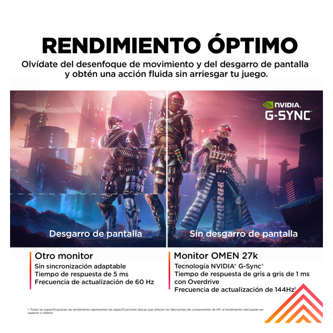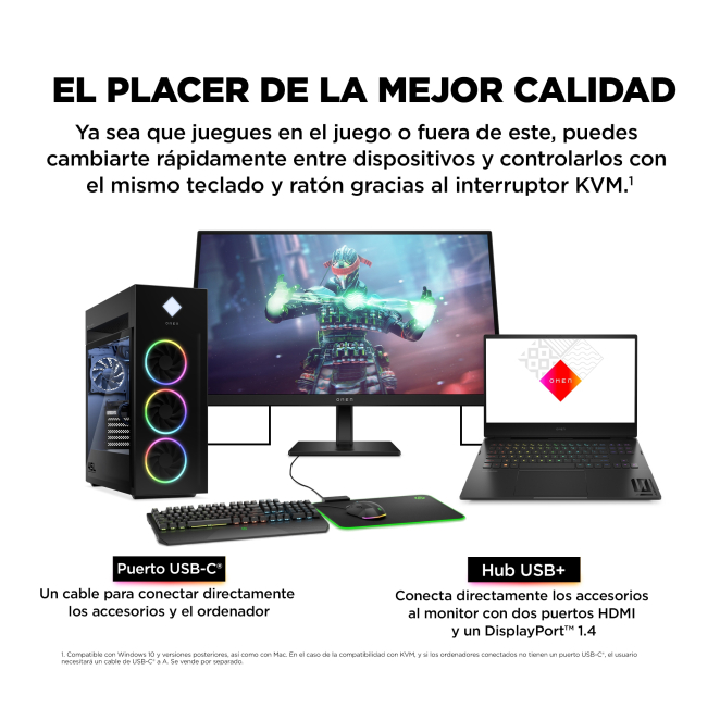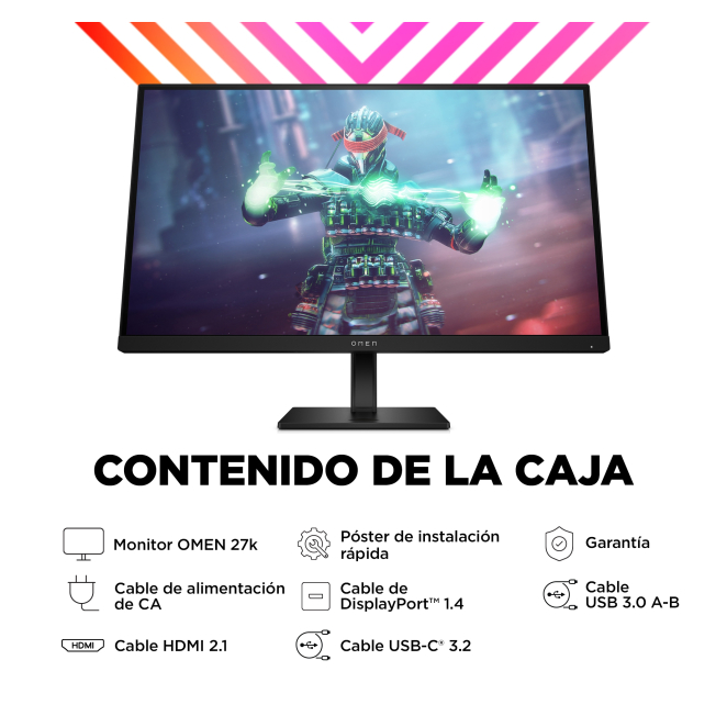 Encuentra aquí las respuestas a las preguntas más frecuentes sobre el OMEN by HP Monitor gaming de 27 pulgadas, UHD y 144 Hz – OMEN 27k. Sí, el OMEN by HP Monitor gaming de 27 pulgadas, UHD y 144 Hz – OMEN 27k es compatible con consolas de última generación, permitiendo disfrutar de juegos en 4K UHD y aprovechar la tasa de actualización de 144Hz. Sí, el monitor permite ajustes de altura, inclinación y pivote, asegurando una configuración ergonómica y personalizada. Sí, el OMEN by HP Monitor gaming de 27 pulgadas, UHD y 144 Hz – OMEN 27k cuenta con altavoces incorporados para ofrecer una experiencia de sonido integrada. El monitor ofrece múltiples opciones de conectividad, incluyendo 2 puertos HDMI, 1 DisplayPort y varias opciones USB, incluyendo USB tipo C. Sí, el OMEN by HP Monitor gaming de 27 pulgadas, UHD y 144 Hz – OMEN 27k incluye un switch KVM que permite controlar dos dispositivos con un solo teclado y ratón. Diagonal de la pantalla 27 " Resolución de la pantalla 3840 x 2160 Pixeles Tipo HD 4K Ultra HD Relación de aspecto nativa 16:9 Relación de aspecto 16:9 Tecnología de visualización LCD Tipo de pantalla IPS Tipo de retroiluminación Edge LED Retroiluminación LED Sí Pantalla táctil No Brillo de la pantalla (típico) 400 cd / m² Tiempo de respuesta 1 ms Superficie de la pantalla Mate Pantalla antirreflectante Sí Forma de la pantalla Plana Formatos gráficos soportados 1024 x 768 (XGA), 1280 x 1024 (SXGA), 1280 x 720 (HD 720), 1280 x 800, 1440 x 900 (WXGA+), 1600 x 900, 1680 x 1050 (WSXGA+), 1920 x 1080 (HD 1080), 1920 x 1200 (WUXGA), 2560 x 1440, 3840 x 2160, 640 x 480 (VGA), 720 x 400, 800 x 600 (SVGA) Razón de contraste (típica) 1000:1 Relación de contraste (dinámico) 10000000:1 Máxima velocidad de actualización 144 Hz Ángulo de visión, horizontal 178 ° Ángulo de visión, vertical 178 ° Número de colores de la pantalla 1,07 billones de colores Tamaño de pixel 0,16 x 0,16 mm Densidad del pixel 163 ppp Intervalo de escaneado horizontal 80-320 kHz Intervalo de escaneado vertical 55-144 Hz Tamaño visible, horizontal 596.7 mm Tamaño visible, vertical 335.7 mm Diagonal de pantalla 68.6 cm Índice de niebla 25 % Dureza de la superficie 3H Gama de colores estándar DCI-P3, sRGB Gama de colores 99 % Gama de colores DCI-P3 95 % Profundidad de color 8 bit Cobertura sRGB (típica) 99 % NVIDIA G-SYNC Sí Tipo de G-SYNC de NVIDIA G-SYNC Compatible AMD FreeSync Sí Tecnología Flicker free (reduce el parpadeo de la pantalla) Sí Tecnología Low Blue Light (baja luz azul) Sí Tipo de FreeSync de AMD FreeSync Premium Compatibilidad con Adaptive Sync de VESA Sí Número de altavoces 2 Potencia estimada RMS 6 W Altavoces incorporados Sí Cámara incorporada No Posicionamiento de mercado Juego Color del producto Negro Soporte desmontable Sí Color de pies Negro Conector USB incorporado Sí Tipo de puerto USB de carga USB Tipo B Cantidad de puertos USB descendentes de tipo A 2 Cantidad de puertos downstream USB tipo C 1 USB Type-C DisplayPort Alternate Mode Sí HDMI Sí Número de puertos HDMI 2 Versión HDMI 2.0/2.1 Cantidad de DisplayPorts 1 Versión de DisplayPort 1.4 Salida de auriculares Sí Salidas para auriculares 1 Auriculares 3,5 mm HDCP Sí montaje VESA Sí Interfaz de panel de montaje 100 x 100 mm Ranura para cable de seguridad No Ajustes de altura Sí Altura ajustable (máx.) 100 mm Eje Sí Ángulo de pivote -90-90 ° Ajuste de la inclinación Sí Ángulo de inclinación -5-20 ° Exhibición en pantalla (OSD) Sí Clase de eficiencia energética (SDR) F Clase de eficiencia energética (HDR) F Consumo de energía (SDR) por 1000 horas 26 kWh Consumo energético 33.5 W Consumo de energía (inactivo) 0.5 W Consumo de energía (max) 83 W Consumo de energía (apagado) 0.3 W Consumo de energía (HDR) por 1000 horas 54 kWh Voltaje de entrada AC 100 - 240 V Frecuencia de entrada AC 50/60 Hz Tipo de fuente de alimentación Interno Escala de eficiencia energética De la A a la G Código EPREL (Registro europeo de productos para el etiquetado energético) 1483407 Intervalo de temperatura operativa 5-35 °C Intervalo de humedad relativa para funcionamiento 5-95 % Intervalo de humedad relativa durante almacenaje 20-80 % Ancho del dispositivo (con soporte) 613.6 mm Profundidad dispositivo (con soporte) 223.3 mm Altura del dispositivo (con soporte) 523.7 mm Peso (con soporte) 7540 g Ancho (sin base) 613.6 mm Profundidad (sin base) 52.2 mm Altura (sin base) 364.3 mm Ancho del paquete 699 mm Profundidad del paquete 160 mm Altura del paquete 446 mm Peso del paquete 10990 g Tipo de embalaje Caja Stand incluido Sí Cables incluidos Corriente alterna, DisplayPort, HDMI, USB tipo A a USB tipo B, USB tipo C a USB tipo C Guía de configuración rápida Sí Certificados de conformidad BIS, BSMI, CB, CCC, CE, CEL, Comisión Federal de Comunicaciones (FCC) de Estados Unidos, EAC, KCC, Norma Oficial Mexicana (NOM), RoHS, VCCI, WEEE Certificación