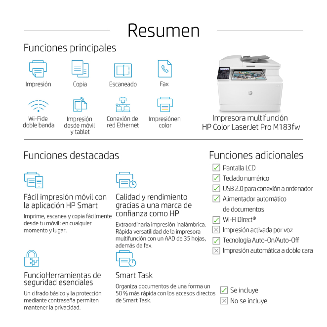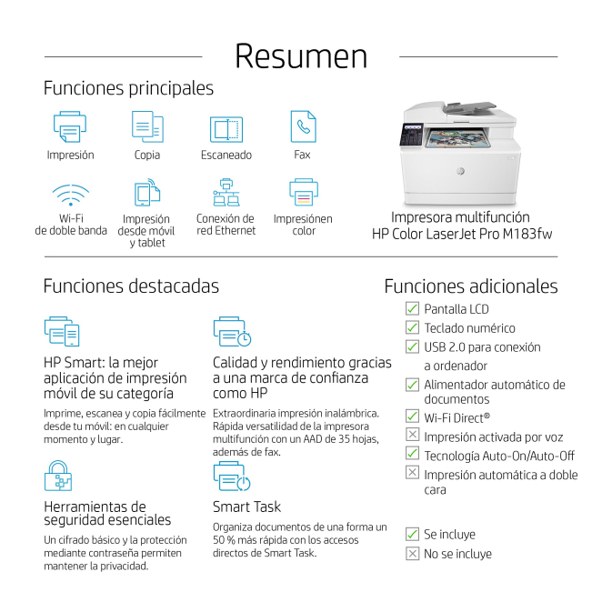 Invertir en la HP Color LaserJet Pro Impresora multifunción M183fw es apostar por calidad y eficiencia en cada tarea de impresión, escaneo, copia y fax. Aquí tienes algunas razones clave para considerar esta impresora: