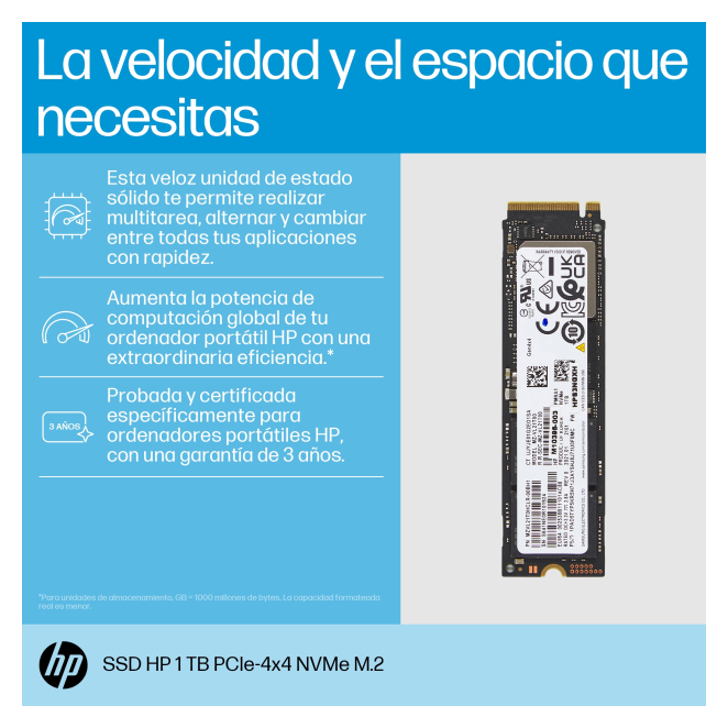 El HP SSD NVMe M.2 PCIe4x4 de 1 TB cuenta con velocidades de lectura de hasta 3400 MB/s y velocidades de escritura de hasta 3000 MB/s, proporcionando un rendimiento ultrarrápido.