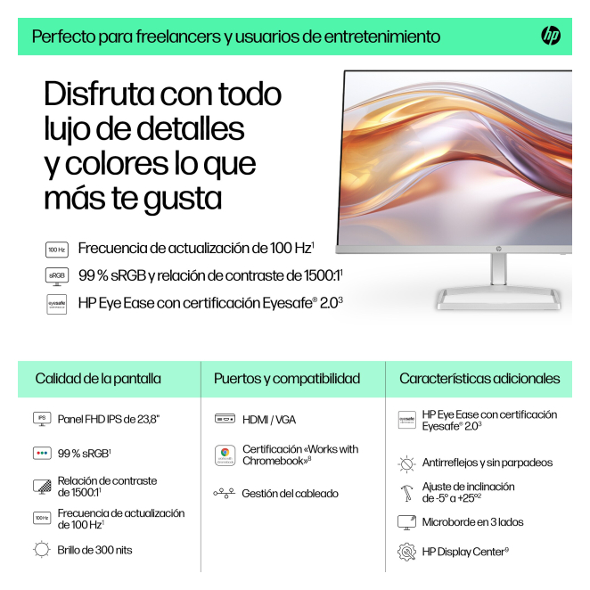 El HP Monitor FHD serie 5 de 23,8 pulgadas – 524sf es ideal para una amplia variedad de usuarios. Profesionales que trabajen desde casa encontrarán en este monitor una excelente herramienta gracias a su gran resolución y tecnología antirreflectante. También es perfecto para gamers casuales y amantes del entretenimiento, quienes disfrutarán de imágenes nítidas y colores vibrantes. Además, aquellos preocupados por la salud ocular apreciarán su baja luz azul y tecnología sin parpadeos, haciendo de este monitor una opción saludable para largas jornadas frente a la pantalla.