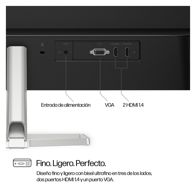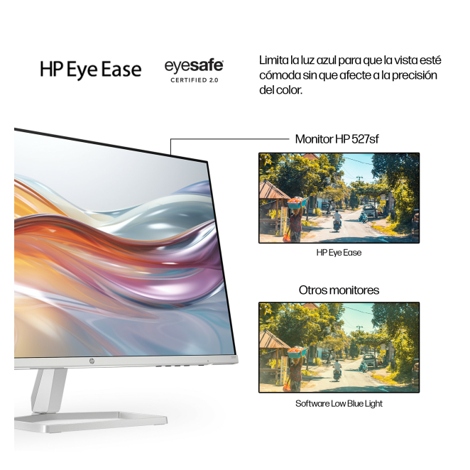 A continuación, respondemos algunas de las preguntas más frecuentes sobre el Monitor FHD HP Serie 5 de 27 pulgadas – 527sf: No, este monitor no es compatible con soportes VESA, pero incluye un soporte desmontable que facilita su instalación. No, este modelo no incluye altavoces integrados. Se recomienda usar altavoces externos para obtener la mejor experiencia de audio. No, este monitor no ofrece compatibilidad con NVIDIA G-Sync ni AMD FreeSync. Sin embargo, su tiempo de respuesta corto y alta frecuencia de actualización lo hacen adecuado para la mayoría de los juegos. Este monitor tiene una calificación de eficiencia energética clase D tanto para contenido SDR como HDR. No, este monitor no incluye puertos USB. Sin embargo, tiene múltiples puertos HDMI para diversas conexiones. Diagonal de la pantalla 27 " Resolución de la pantalla 1920 x 1080 Pixeles Tipo HD Full HD Relación de aspecto nativa 16:9 Relación de aspecto 16:9 Tecnología de visualización LCD Tipo de pantalla IPS Tipo de retroiluminación Edge LED Retroiluminación LED Sí Pantalla táctil No Brillo de la pantalla (típico) 300 cd / m² Tiempo de respuesta 5 ms Superficie de la pantalla Mate Pantalla antirreflectante Sí Forma de la pantalla Plana Formatos gráficos soportados 1024 x 768 (XGA), 1280 x 1024 (SXGA), 1280 x 720 (HD 720), 1280 x 800, 1440 x 900 (WXGA+), 1600 x 900, 1680 x 1050 (WSXGA+), 1920 x 1080 (HD 1080), 640 x 480 (VGA), 720 x 400, 800 x 600 (SVGA) Razón de contraste (típica) 1500:1 Relación de contraste (dinámico) 10000000:1 Máxima velocidad de actualización 100 Hz Ángulo de visión, horizontal 178 ° Ángulo de visión, vertical 178 ° Número de colores de la pantalla 16,7 millones de colores Tamaño de pixel 0,31 x 0,31 mm Densidad del pixel 82 ppp Intervalo de escaneado horizontal 30-113 kHz Intervalo de escaneado vertical 48-100 Hz Tamaño visible, horizontal 553 mm Tamaño visible, vertical 308.6 mm Diagonal de pantalla 68.6 cm Índice de niebla 25 % Dureza de la superficie 3H Frecuencia digital horizontal 30-113 kHz Gama de colores estándar sRGB Gama de colores 99 % Profundidad de color 8 bit Cobertura sRGB (típica) 99 % NVIDIA G-SYNC No AMD FreeSync No Tecnología Flicker free (reduce el parpadeo de la pantalla) Sí Tecnología Low Blue Light (baja luz azul) Sí Altavoces incorporados No Cámara incorporada No Posicionamiento de mercado Hogar Color del producto Blanco Soporte desmontable Sí Color de pies Plata Conector USB incorporado No Cantidad de puertos VGA (D-Sub) 1 HDMI Sí Número de puertos HDMI 2 Versión HDMI 1.4 Salida de auriculares No HDCP Sí montaje VESA No Ranura para cable de seguridad Sí Ajustes de altura No Ajuste de la inclinación Sí Ángulo de inclinación -5-25 ° Exhibición en pantalla (OSD) Sí Clase de eficiencia energética (SDR) D Clase de eficiencia energética (HDR) D Consumo de energía (SDR) por 1000 horas 17 kWh Consumo energético 19 W Consumo de energía (inactivo) 0.5 W Consumo de energía (max) 24 W Consumo de energía (apagado) 0.3 W Voltaje de entrada AC 100 - 240 V Frecuencia de entrada AC 50/60 Hz Tipo de fuente de alimentación Externo Escala de eficiencia energética De la A a la G Código EPREL (Registro europeo de productos para el etiquetado energético) 1832031 Intervalo de temperatura operativa 5-35 °C Intervalo de humedad relativa para funcionamiento 20-80 % Intervalo de humedad relativa durante almacenaje 20-80 % Ancho del dispositivo (con soporte) 607.9 mm Profundidad dispositivo (con soporte) 188.2 mm Altura del dispositivo (con soporte) 437.3 mm Peso (con soporte) 3200 g Ancho (sin base) 607.9 mm Profundidad (sin base) 34.2 mm Altura (sin base) 356 mm Ancho del paquete 690 mm Profundidad del paquete 126 mm Altura del paquete 430 mm Peso del paquete 6390 g Tipo de embalaje Caja Stand incluido Sí Cables incluidos Corriente alterna, HDMI Cumplimiento de sostenibilidad Sí Certificados de sostenibilidad ENERGY STAR Certificados de conformidad BIS, BSMI, CB, CCC, CE, CECP, CEL, Comisión Federal de Comunicaciones (FCC) de Estados Unidos, cTUVus, EAC, ICES, KC, KCC, Norma Oficial Mexicana (NOM), RoHS, VCCI Certificación