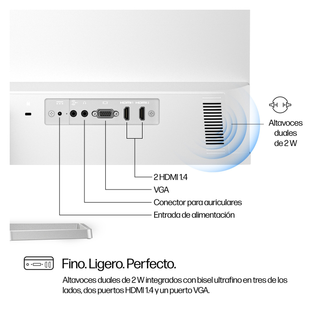 Aquí encontrarás respuestas a las preguntas más comunes sobre el HP Series 5 27 inch FHD Monitor with Speakers – 527sa: Sí, el HP Series 5 27 inch FHD Monitor with Speakers – 527sa viene con altavoces incorporados de 2W, proporcionando una experiencia auditiva envolvente. El HP Series 5 27 inch FHD Monitor with Speakers – 527sa ofrece una excelente calidad de imagen gracias a su resolución Full HD y tecnología IPS, brindando colores precisos y claros desde cualquier ángulo. Sí, con su tasa de actualización de 100 Hz y tiempo de respuesta de 5 ms, el HP Series 5 27 inch FHD Monitor es ideal para juegos y entretenimiento, ofreciendo una experiencia sin retrasos ni parpadeos. El monitor cuenta con dos puertos HDMI 1.4 y una salida de auriculares de 3,5 mm, facilitando la conexión a distintos dispositivos. Sí, el monitor tiene ajuste de la inclinación de -5 a 25 grados y tecnologías como Flicker Free y Low Blue Light para una experiencia más cómoda. Diagonal de la pantalla 27 " Resolución de la pantalla 1920 x 1080 Pixeles Tipo HD Full HD Relación de aspecto nativa 16:9 Relación de aspecto 16:9 Tecnología de visualización LCD Tipo de pantalla IPS Tipo de retroiluminación Edge LED Retroiluminación LED Sí Pantalla táctil No Brillo de la pantalla (típico) 300 cd / m² Tiempo de respuesta 5 ms Superficie de la pantalla Mate Pantalla antirreflectante Sí Forma de la pantalla Plana Formatos gráficos soportados 1024 x 768 (XGA), 1280 x 1024 (SXGA), 1280 x 720 (HD 720), 1280 x 800, 1440 x 900 (WXGA+), 1600 x 900, 1680 x 1050 (WSXGA+), 1920 x 1080 (HD 1080), 640 x 480 (VGA), 720 x 400, 800 x 600 (SVGA) Razón de contraste (típica) 1500:1 Relación de contraste (dinámico) 10000000:1 Máxima velocidad de actualización 100 Hz Ángulo de visión, horizontal 178 ° Ángulo de visión, vertical 178 ° Número de colores de la pantalla 16,7 millones de colores Tamaño de pixel 0,31 x 0,31 mm Densidad del pixel 82 ppp Intervalo de escaneado horizontal 30-113 kHz Intervalo de escaneado vertical 48-100 Hz Tamaño visible, horizontal 553 mm Tamaño visible, vertical 308.6 mm Diagonal de pantalla 68.6 cm Índice de niebla 25 % Dureza de la superficie 3H Gama de colores estándar sRGB Gama de colores 99 % Profundidad de color 8 bit Cobertura sRGB (típica) 99 % NVIDIA G-SYNC No AMD FreeSync No Tecnología Flicker free (reduce el parpadeo de la pantalla) Sí Tecnología Low Blue Light (baja luz azul) Sí Número de altavoces 2 Potencia estimada RMS 4 W Altavoces incorporados Sí Cámara incorporada No Posicionamiento de mercado Hogar Color del producto Plata Bisel frontal Negro / Plateado Soporte desmontable Sí Color de pies Plata Conector USB incorporado No Cantidad de puertos VGA (D-Sub) 1 HDMI Sí Número de puertos HDMI 2 Versión HDMI 1.4 Salida de auriculares Sí Salidas para auriculares 1 Auriculares 3,5 mm HDCP Sí montaje VESA No Ranura para cable de seguridad Sí Ajustes de altura No Ajuste de la inclinación Sí Ángulo de inclinación -5-25 ° Exhibición en pantalla (OSD) Sí Clase de eficiencia energética (SDR) D Clase de eficiencia energética (HDR) D Consumo de energía (SDR) por 1000 horas 17 kWh Consumo energético 23 W Consumo de energía (inactivo) 0.5 W Consumo de energía (max) 31 W Consumo de energía (apagado) 0.3 W Voltaje de entrada AC 100 - 240 V Frecuencia de entrada AC 50/60 Hz Tipo de fuente de alimentación Externo Escala de eficiencia energética De la A a la G Código EPREL (Registro europeo de productos para el etiquetado energético) 1832047 Intervalo de temperatura operativa 5-35 °C Intervalo de humedad relativa para funcionamiento 20-80 % Intervalo de humedad relativa durante almacenaje 20-80 % Ancho del dispositivo (con soporte) 607.9 mm Profundidad dispositivo (con soporte) 188.2 mm Altura del dispositivo (con soporte) 437.3 mm Peso (con soporte) 3280 g Ancho (sin base) 607.9 mm Profundidad (sin base) 34.2 mm Altura (sin base) 356 mm Ancho del paquete 690 mm Profundidad del paquete 126 mm Altura del paquete 430 mm Peso del paquete 6470 g Tipo de embalaje Caja Stand incluido Sí Cables incluidos Corriente alterna, HDMI Adaptador de corriente incluido Sí Certificados de sostenibilidad ENERGY STAR Certificados de conformidad BIS, BSMI, CB, CCC, CE, CECP, CEL, Comisión Federal de Comunicaciones (FCC) de Estados Unidos, cTUVus, EAC, ICES, KC, KCC, Norma Oficial Mexicana (NOM), RoHS, VCCI Certificación