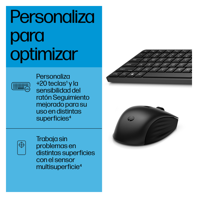 HP conjunto de teclado y ratón inalámbricos modelo 655 con alta precisión y SKU 4R009UT#ABE Este producto se puede comprar bajo demanda. Financiado desde: 2,87 € /mes Solicita información en caso de necesitar envío urgente. Métodos de pago: HP Conjunto de teclado y ratón inalámbricos 655 El HP Conjunto de teclado y ratón inalámbricos 655 se presenta como la solución ideal para quienes buscan comodidad, productividad y estilo en su espacio de trabajo. Diseñado especialmente para la oficina con un formato de teclado completo y un ratón ambidextro, este kit ofrece conectividad RF inalámbrica con un alcance de hasta 10 metros. Además, el teclado incluye 19 teclas de acceso rápido, lo que facilita la personalización y el acceso a funciones esenciales. Este kit se motiva gracias a pilas AAA, garantizando así una larga duración sin la necesidad constante de recarga. HP Conjunto de teclado y ratón inalámbricos 655 es la elección definitiva para quienes buscan eficiencia y estética en un solo paquete.