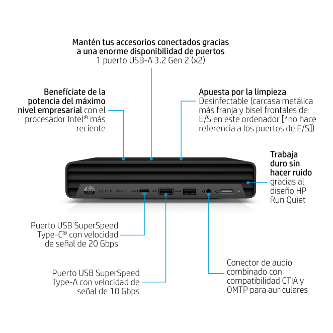 El HP Elite Mini 800 G9 está diseñado para profesionales que requieren un equipo potente y compacto. Ideal para ejecutivos, analistas y creativos que necesitan un rendimiento de alta calidad en un formato pequeño. Este Mini PC es perfecto para oficinas con espacios reducidos o para aquellos que buscan una solución portátil sin sacrificar el poder de procesamiento.