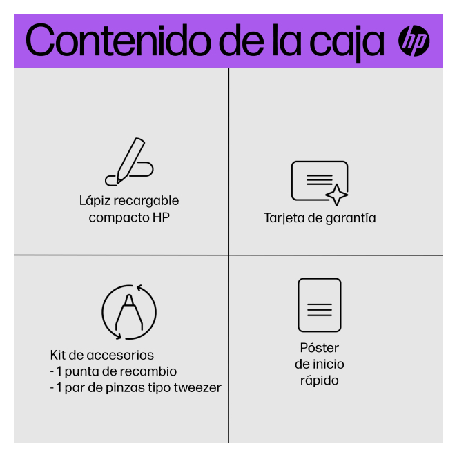 Aquí tienes algunas de las preguntas más frecuentes sobre el HP Lápiz recargable Slim: No, el HP Lápiz recargable Slim está diseñado específicamente para determinados modelos de HP ProBook. Gracias a su conector pogo, el HP Lápiz recargable Slim se carga rápida y eficazmente en cualquier dirección. Sí, el HP Lápiz recargable Slim permite escribir, dibujar y tomar notas cómodamente, ofreciendo una gran precisión. El HP Lápiz recargable Slim tiene un peso ligero de 13.9 gramos, facilitando su uso prolongado. Sí, el HP Lápiz recargable Slim cuenta con garantía del fabricante, asegúrate de revisar los términos específicos al momento de la compra. Color del producto Negro Ancho 133.6 mm Profundidad 7 mm Altura 8 mm Peso 13.9 g Profundidad del paquete 13.9 mm