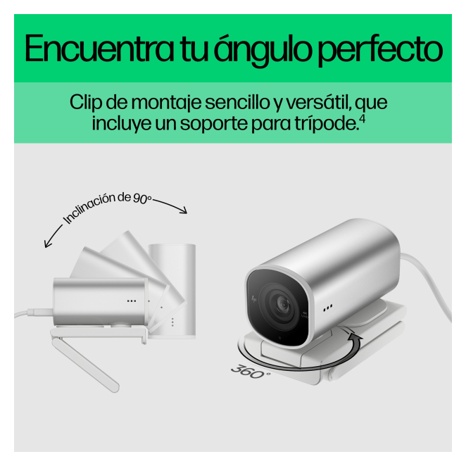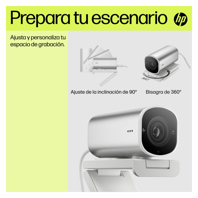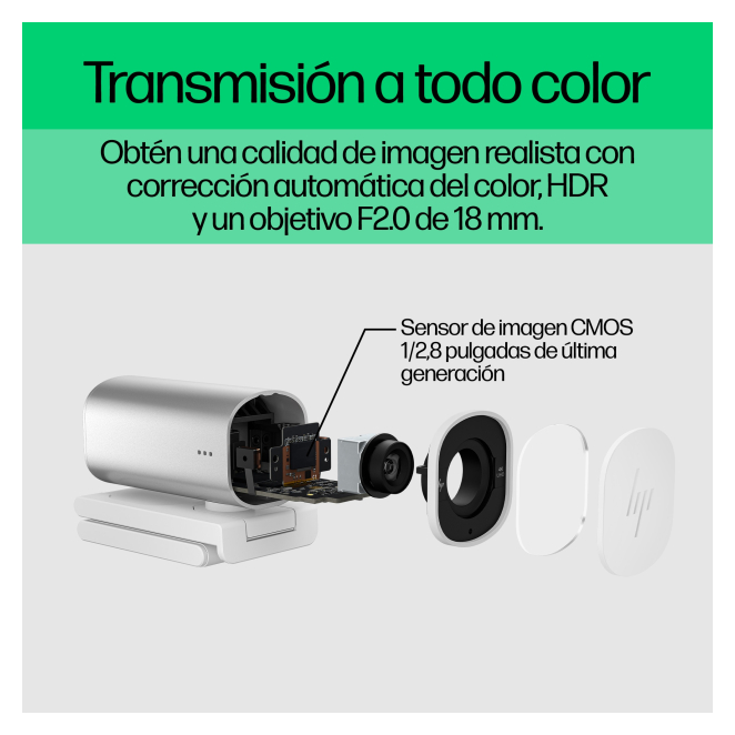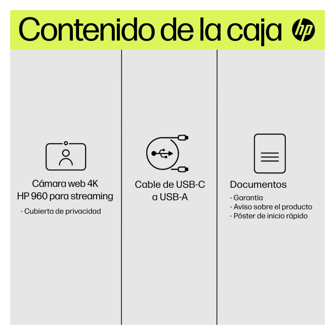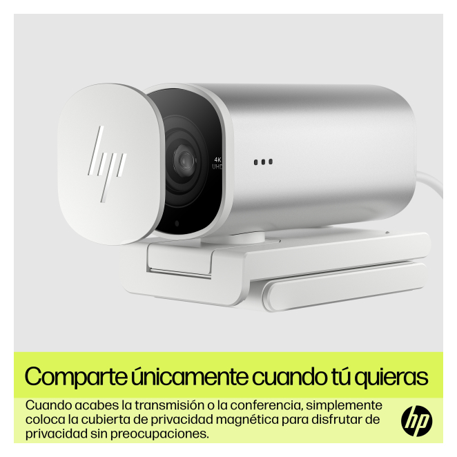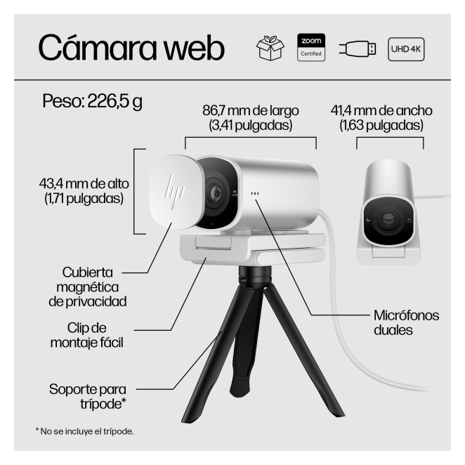 Aquí respondemos a algunas de las preguntas más comunes sobre la HP Webcam 4K 960 para streaming: Sí, la HP Webcam 4K 960 es compatible con Zoom, Microsoft Teams, Google Meet y otras plataformas de videoconferencia. Sí, la webcam cuenta con autoenfoque, lo que facilita mantener una imagen clara y enfocada durante su uso. No, la HP Webcam 4K 960 para streaming funciona con una configuración plug-and-play a través de USB, sin necesidad de software adicional. El cable USB de la HP Webcam 4K 960 tiene una longitud de 1.5 metros, proporcionando suficiente flexibilidad para la ubicación. Sí, la HP Webcam 4K 960 es perfecta para streaming en vivo y gaming gracias a su alta resolución y audio claro. Megapixeles 8 MP Máxima resolución de video 3840 x 2160 Pixeles Velocidad máxima de cuadro 30 pps Tipo de cámara HD 4K Ultra HD Capacidad de zoom Sí Autoenfoque Sí Zoom digital 5 x Interfaz USB Color del producto Plata Tipo de montaje Puesto Flash integrado No Longitud de cable 1.5 m Sistema operativo Windows soportado Windows 10, Windows 11 Sistema operativo MAC soportado Mac OS X 10.10 Yosemite Otros sistemas operativos soportados ChromeOS Micrófono incorporado Sí número de micrófonos 2 Ancho 41.4 mm Peso 225 g Peso (con soporte) 225 g Profundidad 43.4 mm Altura 86.7 mm Ancho del paquete 139 mm Profundidad del paquete 110 mm Altura del paquete 73 mm Peso del paquete 412 g Cables incluidos USB Type A Manual de usuario Sí Guía de instalación rápida Sí