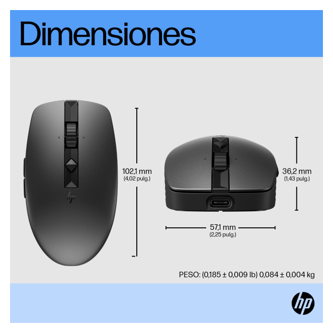 Aquí encontrarás respuestas a las preguntas más frecuentes sobre el HP Ratón silencioso recargable 710. Si tienes alguna duda adicional, no dudes en contactarnos. La batería del HP Ratón silencioso recargable 710 dura aproximadamente 90 días con una sola carga. Sí, el diseño ambidextro del HP Ratón silencioso recargable 710 lo hace adecuado tanto para usuarios diestros como zurdos. Sí, gracias a su sensor de seguimiento sobre cristal, el HP Ratón silencioso recargable 710 funciona perfectamente en superficies de vidrio. No, el HP Ratón silencioso recargable 710 no requiere un adaptador AC para su carga. Puedes cargarlo mediante un puerto USB. El HP Ratón silencioso recargable 710 tiene seis botones programables para adaptarse a tus necesidades de trabajo. Utilizar con Oficina Interfaz del dispositivo RF Wireless + Bluetooth Resolución de movimiento 3000 DPI Tipo de desplazamiento Rueda Cantidad de botones 7 Número de botones programables 6 Versión de Bluetooth 5.3 Factor de forma Ambidextro Color del producto Negro Alcance inalámbrico 10 m Fuente de energía Baterías Recargable Sí Tipo de batería Batería integrada Tecnología de batería Ión de litio Potencia de carga requerida (mín.) 5 W Potencia de carga requerida (máx.) 15 W Sistema operativo Windows soportado Windows 10, Windows 11 Sistema operativo MAC soportado Si Otros sistemas operativos soportados ChromeOS Ancho 102.1 mm Peso 84 g Profundidad 57.1 mm Altura 36.2 mm Cantidad por paquete 1 pieza(s) Ancho del paquete 105 mm Profundidad del paquete 150 mm Altura del paquete 55.8 mm Peso del paquete 260 g Adaptador AC incluido No