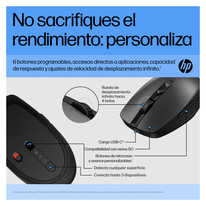HP Ratón Silencioso Recargable modelo 710 con conectividad inalámbrica y diseño ergonómico. SKU 6E6F2AA#ABB Este producto está retirado de la venta por el fabricante y no se puede comprar. El precio del producto no está disponible. Solicita información en caso de necesitar envío urgente. Métodos de pago: Ratón inalámbrico recargable HP 710 El HP Ratón silencioso recargable 710 ofrece una combinación de funcionalidad de avanzada con un diseño elegante y cómodo. Es un ratón inalámbrico con conectividad por RF Wireless y Bluetooth, y una resolución de movimiento de 3000 DPI que asegura una precisión óptima. Ideal para uso en oficina, este dispositivo cuenta con siete botones, de los cuales seis son programables. Con una autonomía de hasta 90 días y una batería integrada de ión de litio, el HP Ratón silencioso recargable 710 garantiza una experiencia libre de preocupaciones, permitiéndote concentrarte en lo que realmente importa: tu trabajo. Your browser does not support the video tag.