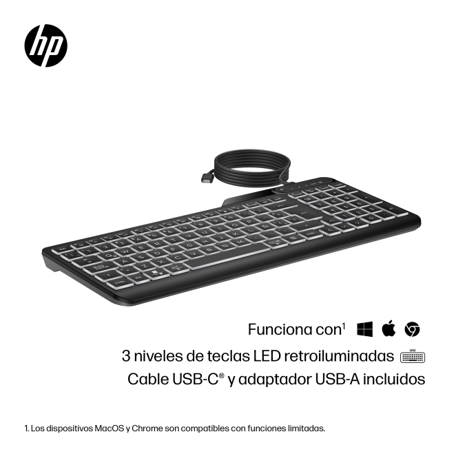 El HP Teclado con cable retroiluminado multidispositivo 405 brinda una experiencia de escritura cómoda gracias a sus teclas de membrana suaves y silenciosas. Su perfil bajo reduce la fatiga en las muñecas, permitiendo horas de uso sin molestias. Las teclas de acceso rápido programables facilitan la personalización y optimización del flujo de trabajo. La retroiluminación con varios niveles de brillo asegura que pueda usar su teclado en cualquier condición de luz. Con su conectividad USB, la instalación es tan simple como plug-and-play, lo que hace que el teclado HP sea extremadamente fácil de usar y configurar.