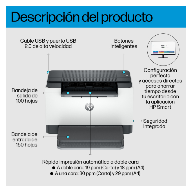 HP LaserJet Impresora M209d, impresora monocromática compacta, SKU 8J9L0F#B19 Este producto se puede comprar bajo demanda. Financiado desde: 6,23 € /mes Solicita información en caso de necesitar envío urgente. Métodos de pago: HP LaserJet Impresora M209d – Rendimiento Compacto y Alta Productividad La HP LaserJet Impresora M209d es la solución ideal para quienes buscan una impresora láser eficiente en un formato compacto. Con una capacidad de impresión a doble cara automática y una velocidad de 29 páginas por minuto, esta impresora se destaca en su segmento. Su resolución de 600 x 600 garantizan impresiones nítidas y de alta calidad. Diseñada para pequeñas y medianas empresas, la HP LaserJet Impresora M209d combina productividad y economía, ocupando el mínimo espacio en su escritorio. A continuación, verás un video explicativo del producto.