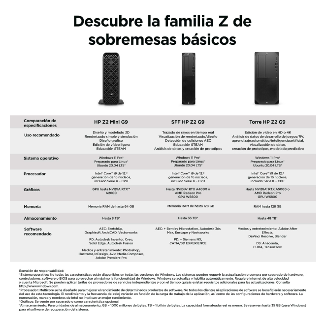 Encuentra respuestas a las preguntas más comunes sobre el HP Z2 G9 Mini PC Workstation: La HP Z2 G9 Mini PC Workstation utiliza un potente procesador Intel Core i9 i9-14900, ideal para tareas que requieren alto rendimiento y multitasking. Sí, la HP Z2 G9 Mini PC Workstation viene equipada con una tarjeta gráfica dedicada NVIDIA RTX A2000, perfecta para gráficos avanzados y rendering 3D. El HP Z2 G9 Mini PC Workstation es compatible con Wi-Fi 6E, ofreciendo una conectividad inalámbrica rápida y eficiente para todas tus necesidades de red. Sí, el HP Z2 G9 Mini PC Workstation permite expandir la memoria hasta un máximo de 64 GB, gracias a sus dos ranuras SO-DIMM. El modelo viene con Windows 11 Pro preinstalado, ofreciendo una experiencia de usuario avanzada, segura y eficiente. Sí, la HP Z2 G9 Mini PC Workstation incluye tanto un teclado como un ratón alámbricos, garantizando que tienes todo lo necesario para empezar a trabajar de inmediato. Fabricante de procesador Intel Familia de procesador Intel® Core™ i9 Generación del procesador Intel Core i9-14xxx Modelo del procesador i9-14900 Número de núcleos de procesador 24 Número de hilos de ejecución 32 Núcleos de rendimiento 8 Núcleos de eficiencia 16 Frecuencia del procesador turbo 5.4 GHz Frecuencia turbo máxima del núcleo de rendimiento 5.4 GHz Frecuencia turbo máxima del núcleo de eficiencia 4.3 GHz Frecuencia base de núcleo eficiente 1.5 GHz Frecuencia base de núcleo de rendimiento 2 GHz Caché del procesador 36 MB Tipo de cache en procesador L3 Potencia base del procesador 65 W Potencia turbo máxima 219 W Memoria interna 32 GB Memoria interna máxima 64 GB Tipo de memoria interna DDR5-SDRAM Velocidad de memoria del reloj 5600 MHz Disposición de la memoria 2 x 16 GB Ranuras de memoria 2x SO-DIMM ECC No No ECC Sí Capacidad total de almacenaje 1000 GB Unidad de almacenamiento SSD Número de unidades de almacenamiento instaladas 1 SDD, capacidad 1000 GB Interfaces del SDD PCI Express 4.0 NVMe Sí Factor de forma de disco SSD M.2 Tipo de unidad óptica No Adaptador gráfico incorporado Sí Modelo de adaptador gráfico incorporado Intel UHD Graphics 770 Modelo de adaptador de gráficos discretos NVIDIA RTX A2000 Fabricante de GPU (unidad de procesamiento gráfico) integrada Intel Fabricante de GPU (unidad de procesamiento gráfico) externa NVIDIA Adaptador de gráficos discreto Sí Número de adaptadores de gráficos discretos 1 Familia de adaptador gráfico incorporado Intel® UHD Graphics Capacidad memoria de adaptador gráfico 12 GB Tipo de memoria de gráficos discretos GDDR6 Altavoces incorporados Sí Chip de sonido Realtek ALC3205-VA2-CG Ethernet Sí Ethernet LAN, velocidad de transferencia de datos 10 Mbit/s, 100 Mbit/s, 1000 Mbit/s Tecnología de cableado 10/100/1000Base-T(X) Wifi Sí Estándar Wi-Fi Wi-Fi 6E (802.11ax) Wi-Fi estándares Wi-Fi 6E (802.11ax) Fabricante del controlador WLAN Intel Modelo de controlador WLAN Intel Wi-Fi 6E AX211 Bluetooth Sí Versión de Bluetooth 5.3 Tipo de antena 2x2 Cantidad de DisplayPorts 2 Versión de DisplayPort 1.4 Ethernet LAN (RJ-45) cantidad de puertos 1 Combo de salida de auriculares / micrófono del puerto Sí Tipo de chasis Mini PC Tipo de producto Puesto de trabajo Color del producto Negro Año de introducción 2024 Posicionamiento de mercado Rendimiento Protección mediante contraseña Sí Protección con contraseña BIOS, Encendido, Usuario Software preinstalado Software incluido HP Wolf Pro Security Edition (1 año) Sistema operativo instalado Windows 11 Pro Fuente de alimentación 280 W Fuente de alimentación, voltaje de entrada 100 - 240 V Fuente de alimentación, frecuencia de entrada 50/60 Hz Herramientas de seguridad HP Segmento HP Negocios Cumplimiento de sostenibilidad Sí Certificados de sostenibilidad ENERGY STAR, TCO Materiales y tecnologías sostenibles Total de huella de carbono (kg of CO2e) 260 Emisiones de carbono, fabricación (kg de CO2e) 197 Emisiones de carbono, logística (kg de CO2e) 2 Emisiones de carbono, fin de vida útil (kg de CO2e) 1 Emisiones de carbono, sin fase de uso (kg de CO2e) 57 Ancho 211 mm Profundidad 218 mm Altura 69 mm Peso 2400 g Pantalla incluida No Ratón incluido Sí Incluye teclado Sí Conectividad del ratón Alámbrico Conectividad del teclado Alámbrico