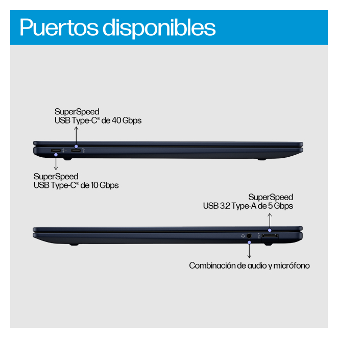 A continuación, respondemos a las preguntas más comunes sobre el HP EliteBook Ultra G1q Qualcomm Snapdragon X1E-78-100: El portátil cuenta con un SSD de 1 TB, proporcionando suficiente espacio para todas tus aplicaciones y archivos importantes. Este portátil cuenta con Wi-Fi 7 y Bluetooth 5.4, asegurando conexiones rápidas y estables en todo momento. Sí, su procesador Qualcomm Snapdragon X Elite y 32 GB de RAM lo hacen ideal para aplicaciones de IA, edición de video y otras tareas exigentes. Sí, el teclado es retroiluminado, lo que facilita el uso en condiciones de poca luz. El portátil viene con Windows 11 Pro preinstalado, proporcionando una experiencia de usuario segura y eficiente. Nombre del color Azul atmosférico Tipo de producto Portátil Color del producto Azul Factor de forma Concha Posicionamiento de mercado Premium Nombre de marca original HP Diagonal de la pantalla 14 " Resolución de la pantalla 2240 x 1400 Pixeles Pantalla táctil Sí Tipo HD 2.2K Tipo de pantalla IPS Superficie de la pantalla Brillo Pantalla antirreflectante Sí Superficie de la pantalla Brillo Brillo de pantalla 400 cd / m² Fabricante de procesador Qualcomm Familia de procesador Qualcomm Snapdragon Generación del procesador Snapdragon X Elite Modelo del procesador X1E-78-100 Número de núcleos de procesador 12 Frecuencia del procesador turbo 3.4 GHz Caché del procesador 42 MB Unidad de procesamiento neuronal (NPU) Qualcomm Hexagon Memoria interna 32 GB Memoria interna máxima 32 GB Tipo de memoria interna LPDDR5x-SDRAM Velocidad de memoria del reloj 8533 MHz Forma de factor de memoria Incorporado Factor de forma de disco SSD M.2 Disposición de la memoria No disponible GB Capacidad total de almacenaje 1000 GB Unidad de almacenamiento SSD Capacidad total de SSD 1000 GB SDD, capacidad 1000 GB Número de unidades SSD instalados 1 Interfaces del SDD PCI Express 4.0 NVMe Sí Factor de forma de disco SSD M.2 Modelo de adaptador de gráficos discretos No disponible Adaptador gráfico incorporado Sí Fabricante de GPU (unidad de procesamiento gráfico) integrada Qualcomm Adaptador de gráficos discreto No Modelo de adaptador gráfico incorporado Qualcomm Adreno GPU Número de altavoces incorporados 2 número de micrófonos 2 Cámara frontal Sí Resolución de la cámara frontal (numérica) 5 MP Cámara infrarroja (IR) Sí Estándar Wi-Fi Wi-Fi 7 (802.11be) Wi-Fi estándares Wi-Fi 7 (802.11be) Conexión a red móvil No Modelo de controlador WLAN Qualcomm FastConnect 7800 Fabricante del controlador WLAN Qualcomm Tipo de antena 2x2 Bluetooth Sí Versión de Bluetooth 5.4 Cantidad de puertos tipo C USB 3.2 Gen 2 (3.1 Gen 2) 1 Retroiluminación de teclado Sí Teclado de tamaño completo Sí Nombre del color del teclado Azul atmosférico Sistema operativo instalado Windows 11 Pro Adaptador inteligente AC HP Sí Segmento HP Negocios General Product Safety Regulation (GPSR) URL https://support.hp.com/us-en/document/ish_6126692-6126777-16?openCLC=true Tecnología de batería Polímero de litio Número de celdas de batería 3 Capacidad de batería 59 Wh Potencia de adaptador AC 65 W Frecuencia de adaptador AC 50 - 60 Hz Voltaje de entrada de adaptador AC 100 - 240 V Suministro de potencia USB Sí Puerto de carga USB tipo C Sí Protección mediante contraseña Sí Protección con contraseña BIOS, Encendido, Usuario Certificados de conformidad RoHS, VCCI Cumplimiento de sostenibilidad Sí Certificados de sostenibilidad ENERGY STAR, TCO Materiales y tecnologías sostenibles 5 % de plástico reciclado posconsumo; 50 % de plástico reciclado posconsumo Ancho 312.9 mm Profundidad 223.5 mm Altura (frente) 8.4 mm Altura (posterior) 11.2 mm Total de huella de carbono (kg of CO2e) 200 Emisiones de carbono, fabricación (kg de CO2e) 176 Emisiones de carbono, logística (kg de CO2e) 9 Emisiones de carbono, fin de vida útil (kg de CO2e) 2 Emisiones de carbono, sin fase de uso (kg de CO2e) 9 Ancho del paquete 80 mm Profundidad del paquete 430 mm Altura del paquete 315 mm