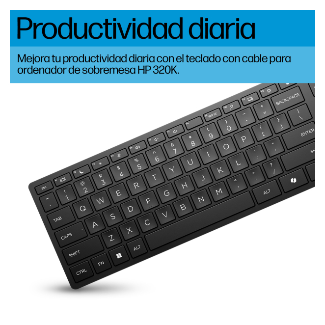 Aquí encontrarás respuestas a algunas de las preguntas más comunes sobre el HP Teclado de sobremesa con cable 320K: No, el HP Teclado de sobremesa con cable 320K no incluye ratón. Es un teclado independiente y debe comprarse por separado cualquier dispositivo apuntador adicional. No, el teclado de sobremesa HP 320K no cuenta con retroiluminación. El HP Teclado de sobremesa con cable 320K utiliza interruptores de membrana, lo que proporciona una experiencia de escritura cómoda y silenciosa. Sí, el HP Teclado de sobremesa con cable 320K es compatible con la mayoría de los sistemas operativos que acepten dispositivos USB, incluyendo Windows, macOS y Linux. El teclado de sobremesa HP 320K tiene un cable de 1.8 metros de longitud, lo que ofrece una gran flexibilidad para colocarlo en el escritorio. Uso recomendado Oficina Tecnología de conectividad Alámbrico Interfaz del dispositivo USB Interruptor del teclado Interruptor de membrana Dispositivo apuntador No Formato del teclado Completo (100%) Teclado numérico Sí Retroiluminación No Tablero estilo islas Sí Color del producto Negro Longitud de cable 1.8 m Alimentación USB Ratón incluido No Sistema operativo Windows soportado Windows 10, Windows 11 Intervalo de temperatura operativa 10-50 °C Dimensiones de teclado (Ancho x Profundidad x Altura) 426,2 x 110,9 x 16,7 mm Peso del teclado 413 g Ancho del paquete 445 mm Profundidad del paquete 150 mm Altura del paquete 25 mm Peso del paquete 570 g Número de productos incluidos 1 pieza(s)