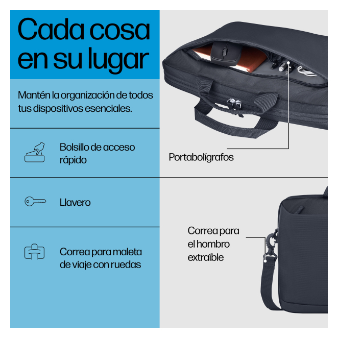 El HP Maletín para portátil Everyday de 16 pulgadas asegura una experiencia de usuario cómoda y sin complicaciones. Su cinta de hombro extraíble y ajustable permite adaptar el maletín a tus necesidades de transporte, mientras que sus múltiples compartimentos interiores facilitan la organización. Además, su resistencia a los golpes y al agua añade una capa extra de protección para tu portátil y accesorios. El tamaño compacto del maletín, junto con su ligereza, hacen que llevarlo contigo sea una tarea sencilla y cómoda, incluso durante largos períodos.