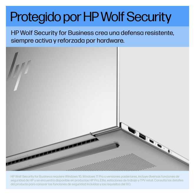 Aquí tienes algunas preguntas frecuentes sobre el HP EliteBook 640 G11: Sí, el HP EliteBook 640 G11 ofrece un rendimiento excelente para tareas de oficina y uso profesional intensivo gracias a su potente procesador, amplia memoria y rápida unidad SSD. Sí, el HP EliteBook 640 G11 incluye características de seguridad avanzadas como lector de huellas digitales y protección mediante contraseña, garantizando la seguridad de tus datos. La batería del HP EliteBook 640 G11 ofrece una capacidad adecuada para una jornada completa de trabajo y cuenta con la funcionalidad de carga rápida. El HP EliteBook 640 G11 pesa aproximadamente 1.39 kg, lo que lo hace fácil de transportar y adecuado para profesionales en movimiento. Sí, el HP EliteBook 640 G11 cuenta con un teclado retroiluminado, lo cual es conveniente para trabajar en condiciones de poca luz. Nombre del color Aluminio pike silver Tipo de producto Portátil Color del producto Gris Factor de forma Concha Posicionamiento de mercado Premium Año de introducción 2024 Nombre de marca original HP Diagonal de la pantalla 14 " Resolución de la pantalla 1920 x 1200 Pixeles Pantalla táctil No Tipo HD WUXGA Tipo de pantalla IPS Retroiluminación LED Sí Pantalla antirreflectante Sí Brillo de pantalla 300 cd / m² Espacio de color RGB NTSC Gama de colores 45 % Fabricante de procesador Intel Familia de procesador Intel Core Ultra 5 Generación del procesador Intel Core Ultra (Serie 1) Modelo del procesador 125U Número de núcleos de procesador 12 Número de hilos de ejecución 14 Núcleos de rendimiento 2 Núcleos de eficiencia de baja potencia 2 Núcleos de eficiencia 8 Frecuencia del procesador turbo 4.3 GHz Frecuencia turbo máxima del núcleo de rendimiento 4.3 GHz Frecuencia turbo máxima del núcleo de eficiencia de baja potencia 2.1 GHz Frecuencia turbo máxima del núcleo de eficiencia 3.6 GHz Frecuencia base de núcleo eficiente 0.8 GHz Frecuencia base de núcleo de rendimiento 1.3 GHz Frecuencia base del núcleo de eficiencia de baja potencia 700 MHz Caché del procesador 12 MB Tipo de cache en procesador L3 Potencia base del procesador 15 W Potencia turbo máxima 57 W Unidad de procesamiento neuronal (NPU) Intel AI Boost Máxima frecuencia del núcleo NPU 1.4 GHz Soporte de dispersión Sí Soporte de efectos de Windows Studio Sí Soporte de tipos de datos de IA en el núcleo NPU FP16, FP32, Int8 Entornos de trabajo de software de IA compatibles con el núcleo NPU DirectML, ONNX RT, OpenVINO, Windows ML Memoria interna 16 GB Memoria interna máxima 64 GB Tipo de memoria interna DDR5-SDRAM Velocidad de memoria del reloj 5600 MHz Forma de factor de memoria SO-DIMM Disposición de la memoria 1 x 16 GB Ranuras de memoria 2x SO-DIMM No ECC Sí Capacidad total de almacenaje 512 GB Unidad de almacenamiento SSD Capacidad total de SSD 512 GB SDD, capacidad 512 GB Número de unidades SSD instalados 1 Interfaces del SDD PCI Express NVMe Sí Tipo de unidad óptica No Modelo de adaptador de gráficos discretos No disponible Adaptador gráfico incorporado Sí Fabricante de GPU (unidad de procesamiento gráfico) integrada Intel Adaptador de gráficos discreto No Modelo de adaptador gráfico incorporado Intel Graphics Micrófono incorporado Sí Número de altavoces incorporados 2 número de micrófonos 2 Cámara frontal Sí Resolución de la cámara delantera 1920 x 1080 Pixeles Tipo de cámara frontal HD Full HD Estándar Wi-Fi Wi-Fi 6E (802.11ax) Wi-Fi estándares Wi-Fi 6E (802.11ax) Conexión a red móvil No Modelo de controlador WLAN Intel Wi-Fi 6E AX211 Fabricante del controlador WLAN Intel Tipo de antena 2x2 Ethernet Sí Ethernet LAN, velocidad de transferencia de datos 10 Mbit/s, 100 Mbit/s, 1000 Mbit/s Bluetooth Sí Versión de Bluetooth 5.3 Cantidad de puertos tipo A USB 3.2 Gen 1 (3.1 Gen 1) 2 Ethernet LAN (RJ-45) cantidad de puertos 1 Número de puertos HDMI 1 Versión HDMI 2.1 Número de puertos Thunderbolt 4 2 Combo de salida de auriculares / micrófono del puerto Sí USB Type-C DisplayPort Alternate Mode Sí Dispositivo apuntador Clickpad Teclado numérico No Retroiluminación de teclado Sí Teclado resistente a líquidos Sí Sistema operativo instalado Windows 11 Pro Tipo de altavoz HP HP Dual Speakers Cámara frontal HP HP Webcam FHD Segmento HP Negocios General Product Safety Regulation (GPSR) URL https://support.hp.com/us-en/document/ish_6126692-6126777-16?openCLC=true Tecnología de batería Ión de litio Número de celdas de batería 3 Capacidad de batería 48 Wh Carga rápida Sí Potencia de adaptador AC 65 W Frecuencia de adaptador AC 50 - 60 Hz Voltaje de entrada de adaptador AC 100 - 240 V Suministro de potencia USB Sí Lector de huella digital Sí Protección mediante contraseña Sí Protección con contraseña BIOS, Encendido, Usuario Certificados de conformidad CE, GS mark, RoHS, VCCI Cumplimiento de sostenibilidad Sí Certificados de sostenibilidad TCO Materiales y tecnologías sostenibles Ancho 318.6 mm Profundidad 224.4 mm Altura (frente) 10.9 mm Altura (posterior) 17 mm Peso 1390 g Total de huella de carbono (kg of CO2e) 140 Emisiones de carbono, fabricación (kg de CO2e) 117 Emisiones de carbono, logística (kg de CO2e) 18 Emisiones de carbono, fin de vida útil (kg de CO2e) 2 Emisiones de carbono, sin fase de uso (kg de CO2e) 8 Ancho del paquete 69 mm Profundidad del paquete 449 mm Altura del paquete 305 mm