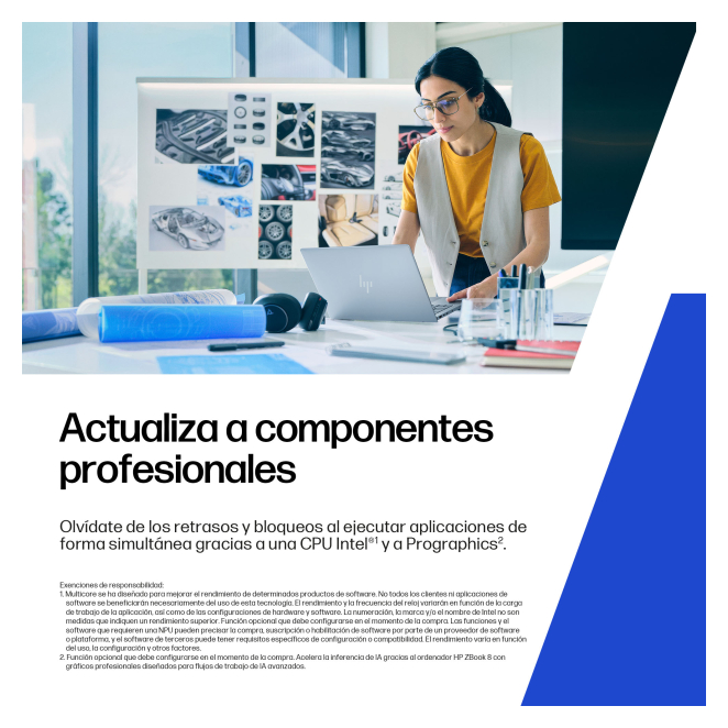 HP ZBook 8 G1i 16 Wolf Pro Security Edition con Intel Core Ultra 9 285H, 16 pulgadas táctil WUXGA, 64GB RAM, 1TB SSD, NVIDIA RTX 500 Ada, Wi-Fi 7 y Windows 11 Pro, SKU A3ZQ5ET#ABE Este producto se puede comprar bajo demanda. Financiado desde: 149,70 € /mes Solicita información en caso de necesitar envío urgente. Métodos de pago: HP ZBook 8 G1i 16 Wolf Pro Security Edition – Data Science Intel Core Ultra 9 285H Estación de trabajo móvil La HP ZBook 8 G1i 16 Wolf Pro Security Edition es una estación de trabajo móvil de alta gama diseñada para profesionales que requieren un rendimiento impecable en cualquier lugar. Equipada con un procesador Intel Core Ultra 9, 64 GB de memoria DDR5-SDRAM y una capacidad de almacenamiento SSD de 1 TB, este dispositivo ofrece una experiencia fluida y eficaz. La pantalla de 16” WUXGA táctil junto a la gráfica NVIDIA RTX 500 garantiza una visualización clara y detallada, ideal para el diseño 3D y herramientas de IA. Además, su conectividad Wi-Fi 7 y el sistema operativo Windows 11 Pro aseguran que siempre estés conectado y productivo. HP ZBook 8 G1i es la solución ideal para profesionales que necesitan combinar rendimiento y movilidad. Gracias a su potente procesador Intel Core Ultra 9, los usuarios pueden ejecutar aplicaciones exigentes con facilidad. La estación de trabajo HP ofrece una memoria DDR5-SDRAM de 64 GB, permitiendo un multitasking sin interrupciones. La capacidad de almacenamiento de 1 TB SSD asegura un rápido acceso a tus archivos y aplicaciones, mientras que la tarjeta gráfica NVIDIA RTX 500 proporciona un rendimiento visual impresionante. La HP ZBook 8 G1i está diseñada especialmente para profesionales de la ciencia de datos, ingenieros, diseñadores gráficos y desarrolladores de software que requieren un rendimiento superior y movilidad. Con su pantalla táctil WUXGA de 16 pulgadas y su procesador robusto, es ideal para aquellos que trabajan con grandes conjuntos de datos, modelado 3D o ediciones de video avanzadas. Gracias a su seguridad avanzada Wolf Pro Security y su batería de larga duración, es perfecta para quienes necesitan trabajar desde cualquier lugar sin preocuparse por la vulnerabilidad de sus datos. Utilizar la HP ZBook 8 G1i es sinónimo de satisfacción y productividad. Su pantalla táctil antirreflectante ofrece una visualización clara incluso en exteriores. El teclado resistente a líquidos y su Clickpad brindan una experiencia de uso cómoda, mientras que su batería de larga duración permite trabajar todo el día sin interrupciones. Además, la conectividad Wi-Fi 7 asegura un acceso rápido a internet y su Bluetooth 5.4 garantiza la sincronización rápida con otros dispositivos. Adquirir la HP ZBook 8 G1i te asegura obtener una herramienta potente y versátil que se adapta a las necesidades de los usuarios más exigentes. A continuación, algunas razones para considerar su compra: Gracias a su procesador Intel Core Ultra 9 y 64 GB de memoria DDR5-SDRAM, puedes ejecutar tareas exigentes sin esfuerzo. Con un SSD de 1 TB, tienes suficiente espacio y velocidad para acceder rápidamente a tus archivos y aplicaciones. La tarjeta gráfica NVIDIA RTX 500 asegura que tus proyectos gráficos y de diseño se vean increíbles. La conjunción de su batería de larga duración y conectividad Wi-Fi 7 te permite trabajar desde cualquier lugar. Con la edición Wolf Pro Security, tus datos estarán protegidos en todo momento. Aquí encontrarás respuestas a las preguntas más frecuentes sobre la HP ZBook 8 G1i. Con esta información, podrás tomar una decisión informada sobre tu compra. Sí, el HP ZBook 8 G1i está equipado con una tarjeta gráfica NVIDIA RTX 500 y un procesador Intel Core Ultra 9, lo que lo hace ideal para software de diseño 3D y aplicaciones intensivas en gráficos. La batería de la HP ZBook 8 G1i es de larga duración y permite trabajar durante más horas sin necesidad de recargar, ideal para usuarios que necesitan movilidad constante. El HP ZBook 8 G1i viene con el sistema operativo Windows 11 Pro instalado, proporcionando una interfaz moderna y características avanzadas para un rendimiento óptimo. Sí, el HP ZBook 8 G1i incluye conectividad Wi-Fi 7 y Bluetooth 5.4, asegurando rápidas y estables conexiones inalámbricas para mantenerse siempre conectado. Absolutamente, la HP ZBook 8 G1i incluye Wolf Pro Security, proporcionando una seguridad avanzada para proteger tus datos sensibles contra amenazas. Nombre del color Plata meteoro Tipo de producto Estación de trabajo móvil Color del producto Plata Factor de forma Concha Posicionamiento de mercado Rendimiento Año de introducción 2025 Nombre de marca original HP Diagonal de la pantalla 16 " Resolución de la pantalla 1920 x 1200 Pixeles Pantalla táctil Sí Tipo HD WUXGA Tipo de pantalla UWVA Retroiluminación LED Sí Relación de aspecto nativa 16:10 Pantalla antirreflectante Sí Brillo de pantalla 300 cd / m² Espacio de color RGB sRGB Gama de colores 62.5 % Fabricante de procesador Intel Familia de procesador Intel Core Ultra 9 Generación del procesador Intel Core Ultra (Series 2) Modelo del procesador 285H Número de núcleos de procesador 16 Número de hilos de ejecución 16 Núcleos de rendimiento 6 Núcleos de eficiencia de baja potencia 2 Núcleos de eficiencia 8 Frecuencia del procesador turbo 5.4 GHz Frecuencia turbo máxima del núcleo de rendimiento 5.4 GHz Frecuencia turbo máxima del núcleo de eficiencia de baja potencia 2.5 GHz Frecuencia turbo máxima del núcleo de eficiencia 4.5 GHz Frecuencia base de núcleo eficiente 2.7 GHz Frecuencia base de núcleo de rendimiento 2.9 GHz Frecuencia base del núcleo de eficiencia de baja potencia 1000 MHz Caché del procesador 24 MB Tipo de cache en procesador L3 Potencia base del procesador 45 W Potencia turbo máxima 115 W Unidad de procesamiento neuronal (NPU) Intel AI Boost Rendimiento total del procesador de hasta 99 TOPs Rendimiento del núcleo NPU de hasta 13 TOPs So