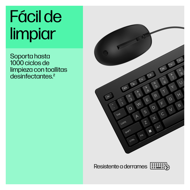 Aquí están algunas preguntas frecuentes que los usuarios suelen tener sobre el HP Combo de teclado y ratón con cable 225: Sí, el HP Combo de teclado y ratón con cable 225 es compatible con la mayoría de los sistemas operativos modernos, incluyendo Windows, macOS y Linux. No, tanto el teclado como el ratón del HP Combo de teclado y ratón con cable 225 no son resistentes al agua. Se recomienda evitar líquidos para prolongar su vida útil. No, el teclado del HP Combo de teclado y ratón con cable 225 no cuenta con retroiluminación. Sí, el ratón del HP Combo de teclado y ratón con cable 225 está diseñado para ser utilizado tanto por usuarios diestros como zurdos. El HP Combo de teclado y ratón con cable 225 cuenta con múltiples certificaciones, incluyendo CE, FCC, IC, RCM, BSMI, EAC, UKCA, KCC, VCCI, ANRT, BIS, NRTL, UkrSepro y RoHS. Uso recomendado Oficina Tecnología de conectividad Alámbrico Interfaz del dispositivo USB Dispositivo apuntador No Formato del teclado Completo (100%) Teclado numérico Sí Vida útil de las teclas del teclado 10 millón de caracteres Distancia de viaje de las teclas 3 mm Certificación CE; FCC; IC; RCM; BSMI; EAC; UKCA; KCC; VCCI; ANRT; BIS; NRTL; UkrSepro; RoHS Retroiluminación No Color del producto Negro Coloración de superficie Monocromo Longitud de cable 1.8 m Alimentación USB Ratón incluido Sí Factor de forma Ambidextro Tecnología de detección de movimientos Óptico Resolución de movimiento 1200 DPI Cantidad de botones 3 Rueda de desplazamiento Sí Tipo de desplazamiento Rueda Rueda de desplazamiento Sí Dimensiones de teclado (Ancho x Profundidad x Altura) 436 x 138 x 20,5 mm Dimensiones del ratón (Ancho x Profundidad x Altura) 112 x 63 x 36 mm Ancho del paquete 527 mm Profundidad del paquete 170 mm Altura del paquete 43 mm Peso del paquete 776 g Número de productos incluidos 2 pieza(s) Adaptador AC incluido No