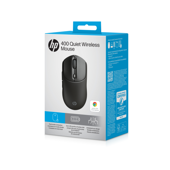 El HP Ratón inalámbrico silencioso 400 utiliza conectividad RF Wireless y Bluetooth 5.2, lo que permite una gran versatilidad de conexión.