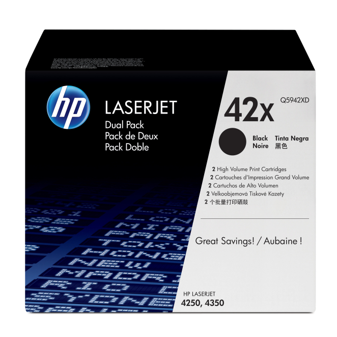 Cada cartucho de tóner del HP Pack de 2 cartuchos de tóner original LaserJet 42X de alta capacidad negro puede imprimir hasta 6000 páginas, proporcionando un alto rendimiento y durabilidad.