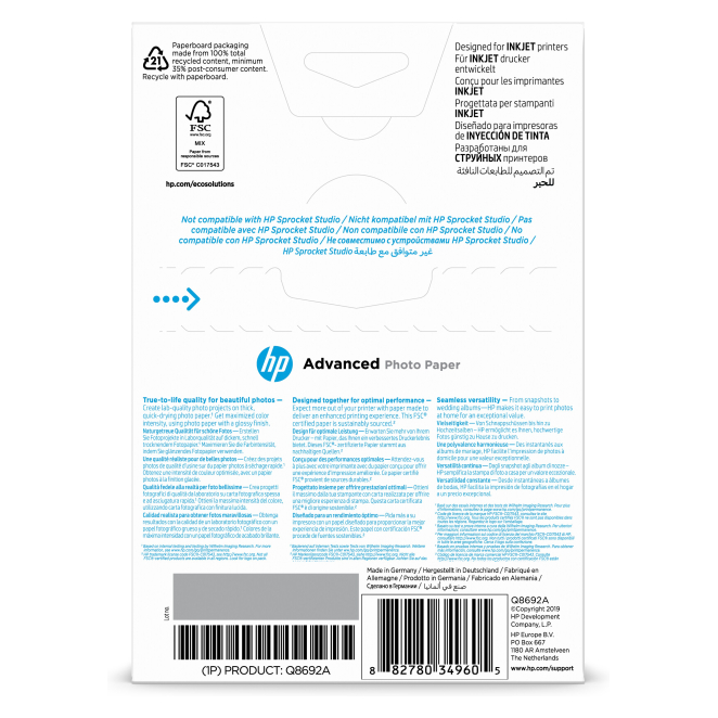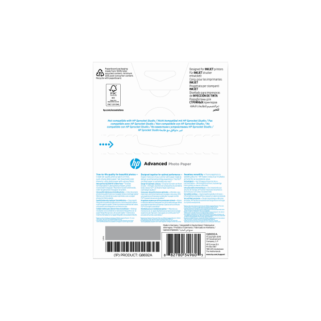 HP Papel fotográfico Advanced con brillo, 100 hojas de 10 por 15 cm, SKU Q8692A