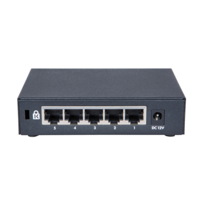Vista del switch HPE OfficeConnect 1420 5G, un dispositivo no administrado L2 con 5 puertos Gigabit Ethernet y SKU JH327A. Carcasa gris en tamaño 1U.