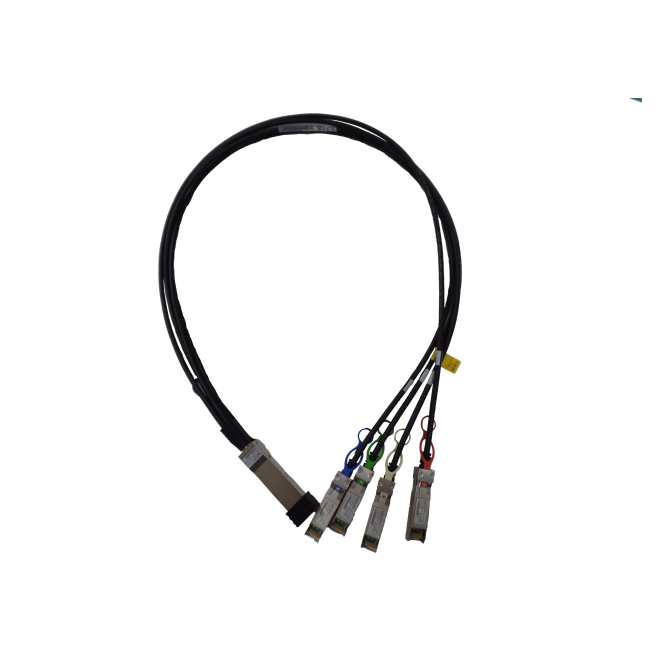 El cable tiene un conector QSFP28 en un extremo y 4x SFP28 en el otro.