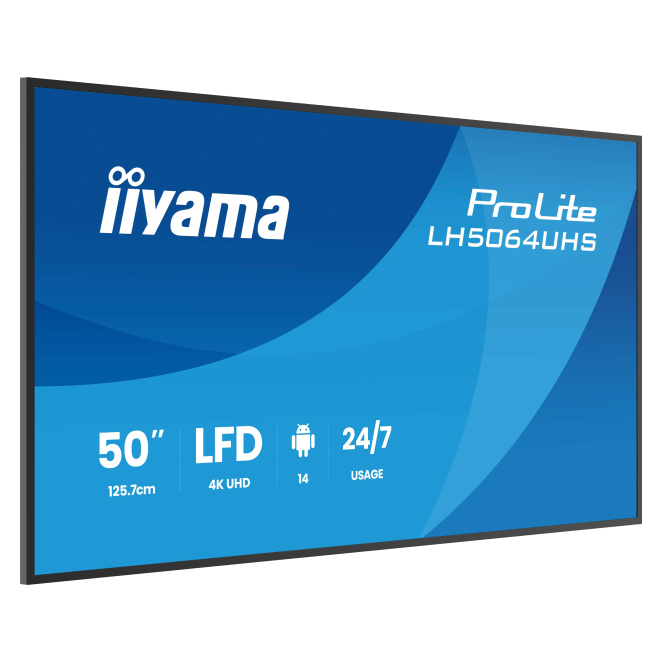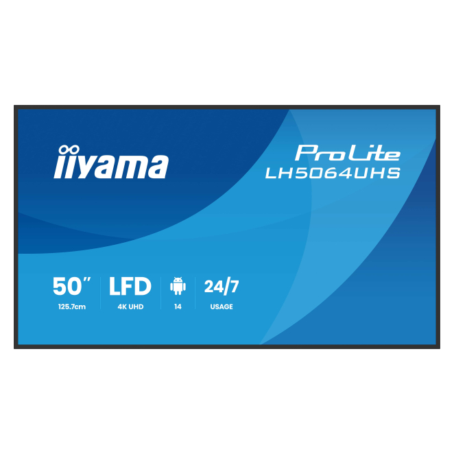 Pantalla de señalización iiyama modelo LH5064UHS-B1AG de 50 pulgadas, 500 cd/m², resolución 4K Ultra HD, en color negro con Wifi integrado. SKU: LH5064UHS-B1AG