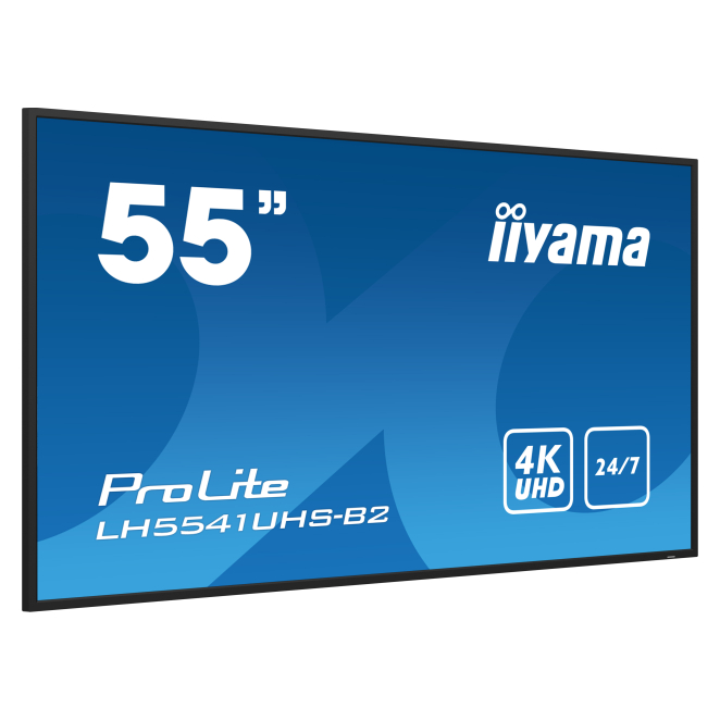 Pantalla de señalización iiyama LCD de 54.6 pulgadas, 4K Ultra HD, modelo LH5541UHS-B2, con procesador incorporado y brillo de 500 cd/m². Ideal para diseño de quiosco.